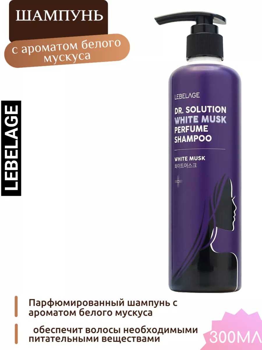 LEBELAGE Dr. Solution White Musk Perfume Shampoo 300ml Парфюмированный шампунь с ароматом белого мускуса 300мл. Добро пожаловать в удивительный мир искусства корейского ухода за волосами! Представляем вашему вниманию корейский парфюмированный шампунь с волшебным ароматом белого мускуса от LEBELAGE. Этот шампунь - настоящая находка для тех, кто стремится к идеальной чистоте волос, превосходному увлажнению и потрясающему аромату!