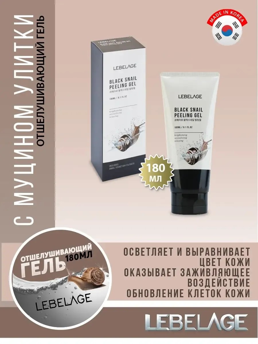 LEBELAGE Black Snail Peeling Gel 180ml. This exfoliating gel brightens, evens out skin tone, and removes dead skin cells. Thanks to snail mucin, the product has a healing effect, stimulates skin cell renewal, and evens out skin tone. Directions: Apply a generous amount to clean, dry skin, avoiding contact with eyes. Gently massage the face for 3 minutes, then rinse with warm water. Precautions: Avoid contact with eyes. If irritation occurs, discontinue use. Nominal volume: 180 ml. Storage conditions: Store at a temperature of 5 to 25°C. Water, Glycerin, Steartrimonium Methosulfate, Alcohol Denat., Butylene Glycol, Carbomer, Phenoxyethanol, Aloe Barbadensis Leaf Juice, Snail Secretion Filtrate, Citrus Reticulata (Tangerine) Peel Extract, Camellia Sinensis Leaf Extract, Glycyrrhiza Uralensis (Licorice) Root Extract, Portulaca Oleracea Extract, Cellulose, Fragrance.