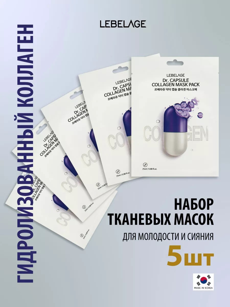 Маска с Гидролизованным Коллагеном для Молодости и Сияния(Набор из 5 одинаковых масок). Наши тканевые маски с гидролизованным коллагеном созданы для предотвращения образования морщин, разглаживания кожи и придания ей сияния. Гидролизованный морской коллаген в составе маски эффективно подтягивает и укрепляет кожу, помогает поддерживать ее упругость и эластичность, а также способствует удержанию влаги. Эта маска подходит для всех типов кожи и предназначена для того, чтобы ваша кожа оставалась молодой и сияющей. Применение маски просто: нанесите ее на предварительно очищенную кожу, разгладьте и оставьте на 15-20 минут. Затем аккуратно удалите маску и массажными движениями распределите остатки эссенции по лицу до полного впитывания. Подарите вашей коже возможность оставаться молодой и сияющей с помощью наших масок с гидролизованным коллагеном, чтобы она всегда выглядела наилучшим образом. Идеальный подарок женщине, маме, подруге, девушке на день рождения, Новый год, 8 марта, день Святого Валентина. Рекомендуется к использованию в комплексе с серией корейской косметики для ухода за лицом, телом и волосами Lebelage.