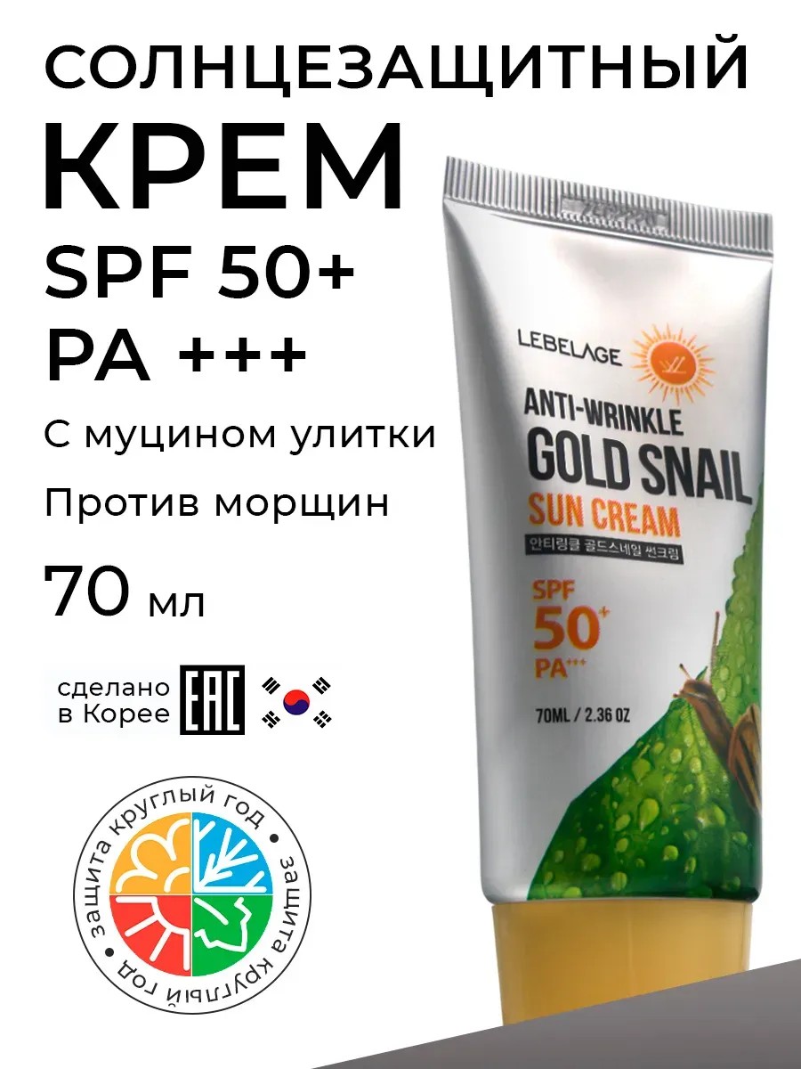 Солнцезащитный крем с муцином золотойулитки против морщин ANTI WRINKLE GOLD SNAIL SUN CREAM SPF50+ PA+++ южнокорейской марки Lebelage подходит всем, особенно рекомендован для кожи с признаками возрастных изменений.Нежная, в меру плотная консистенция легко распределяется на поверхности кожного покрова, хорошо впитывается, надёжно защищает от разрушительного действия ультрафиолета и других солнечных лучей А и В спектра, благодаря фильтру SPF50+ PA+++.Средство также увлажняет, питает, смягчает и разглаживает кожу, устраняет сухость, раздражение и шелушение, предотвращает их появление, укрепляет барьерную функцию эпидермиса, предупреждает фотостарение.Благодаря наличию в составе экстракта азиатской центеллы, гиалуроновой кислоты и коллагена, крем укрепляет и восстанавливает кожу, делает её более подтянутой, надолго сохраняет увлажнение, уменьшает морщины, оказывает противовоспалительное и успокаивающее действие.Преимущества:Высокая степень защиты - Обеспечивает надежную защиту от UVA и UVB лучей с помощью SPF50+ PA+++.Увлажнение - Благодаря гиалуроновой кислоте увлажняет кожу, предотвращая сухость.Питание кожи - Содержит компоненты, которые питают кожу, улучшая её здоровье.Смягчение и разглаживание - Делает кожу более мягкой и гладкой.Устранение раздражений - Успокаивает кожу, устраняет раздражение и шелушение.Противовоспалительное действие - Экстракт азиатской центеллы оказывает противовоспалительное и успокаивающее действие.Предотвращение фотостарения - Защищает от фотостарения, укрепляет барьерную функцию эпидермиса.Укрепление и восстановление - Коллаген помогает укреплять и восстанавливать кожу, делая её более упругой.Уменьшение морщин - Способствует уменьшению морщин, улучшая текстуру кожи.Длительное увлажнение - Надолго сохраняет увлажнение, поддерживая кожу в отличном состоянии.