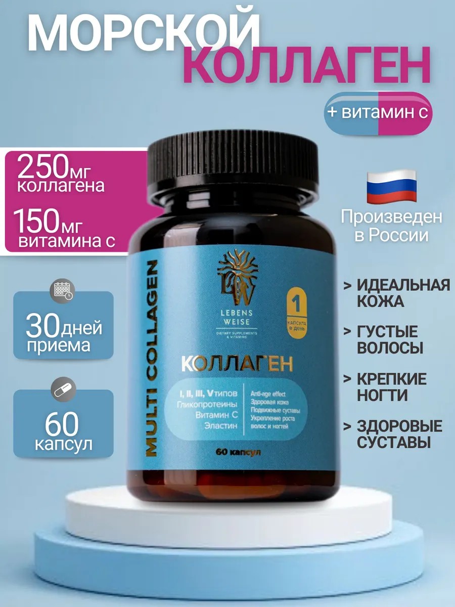 Regular use of a comprehensive collagen supplement will provide a visible anti-aging effect. Collagen is the main building block of connective tissue and is beneficial for all organs and body components. Collagen peptides penetrate deep into the skin, activating regeneration and weight loss processes, improving cardiovascular function, and lowering cholesterol. It helps maintain youthfulness and nourish the skin, slowing the appearance of fine lines and wrinkles. Collagen stimulates hair growth and strengthens nails. Experience the glow of healthy, clear skin and strengthen your joints and ligaments without the need for exercise. The multi-component multivitamin formula is supplemented with elastin, vitamin C, and glycoprotein, which is especially important for maintaining women's and men's health. Natural capsules are easy to take. The intelligent combination of peptide components makes them convenient for daily use by adult men and women. This product is not a medicine or dietary supplement. Maintain your daily beauty and health with vitamin complexes from LEBENS WEISE.