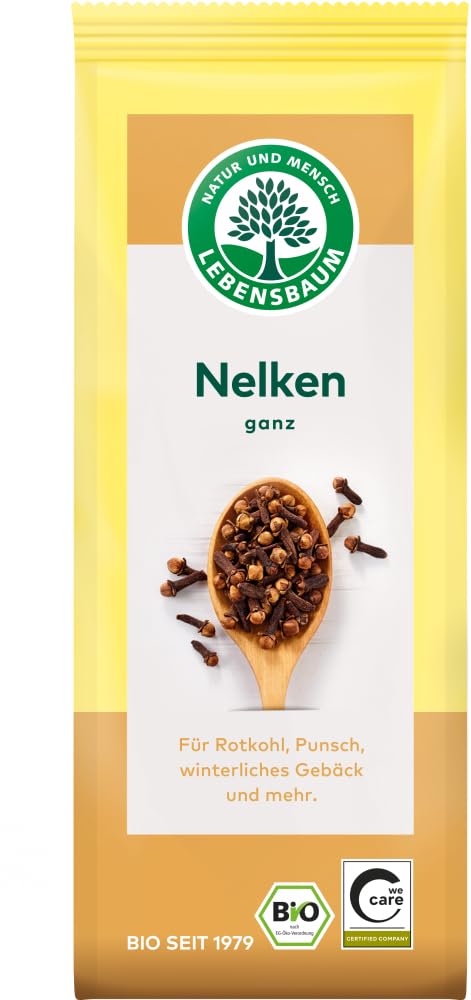 Finish: The flavor of cloves combines sweetness and pepper. This makes them suitable for compotes, pastries, roasts, and red cabbage. Used sparingly and placed in a piece of onion, you can easily remove the aromatic buds before serving. German organic certification label from the EU Organic State. SAFETY WARNING Allergy information: Not used in production: eggs, fish, milk, nuts, peanuts, sesame, gluten, soy, lupin, lint