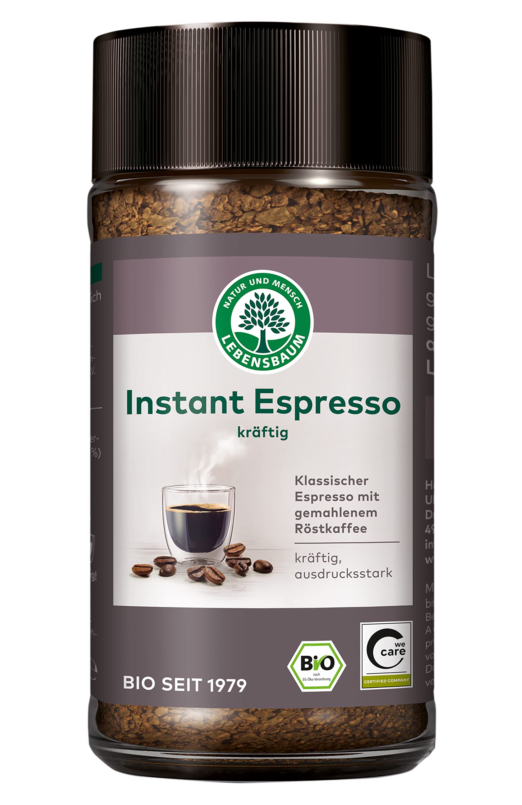 Tree of Life - Espresso Instant - 100 g An expressive espresso when things have to go quickly? No problem with our Instant Espresso. For on the road, on holiday or at the office – wherever there is no espresso machine at hand. The espresso has a strong taste and is easy to prepare. Also ideal for baking. Usage: Preparation: Pour 1 scooped coffee spoon with hot water per cup. INGREDIENTS Soluble bean coffee , freeze-dried, ground roast coffee (3 ) - from controlled ecological production SAFETY WARNING Always close the opened packaging tightly and store in a dry place. Contains caffeine. Not suitable for children under 12 years. Pregnant and breastfeeding women should reduce caffeine consumption. See moreLebensbaum - Espresso Instant - 100 g Levensboom - Espresso Instant - 100 g Een expressieve espresso als het snel moet gaan? Met onze Instant Espresso geen probleem. Voor onderweg, op vakantie of op kantoor – net overal waar geen espressomachine bij de hand is. De espresso is krachtig van smaak en eenvoudig in de bereiding. Ook ideaal om te bakken. Gebruik: Bereiding: per kopje 1 geschufde koffielepel met heet water gieten. INGREDIËNTEN Oplosbare bonenkoffie , gevriesgedroogd, gemalen roostkoffie (3 ) - uit gecontroleerde ecologische productie VEILIGHEIDSWAARSCHUWING De geopende verpakking altijd goed sluiten, droog bewaren. Bevat cafeïne. Niet geschikt voor kinderen onder de 12 jaar. Zwangere vrouwen en vrouwen die borstvoeding geven, moeten het gebruik van cafeïne verminderen. Meer bekijken
