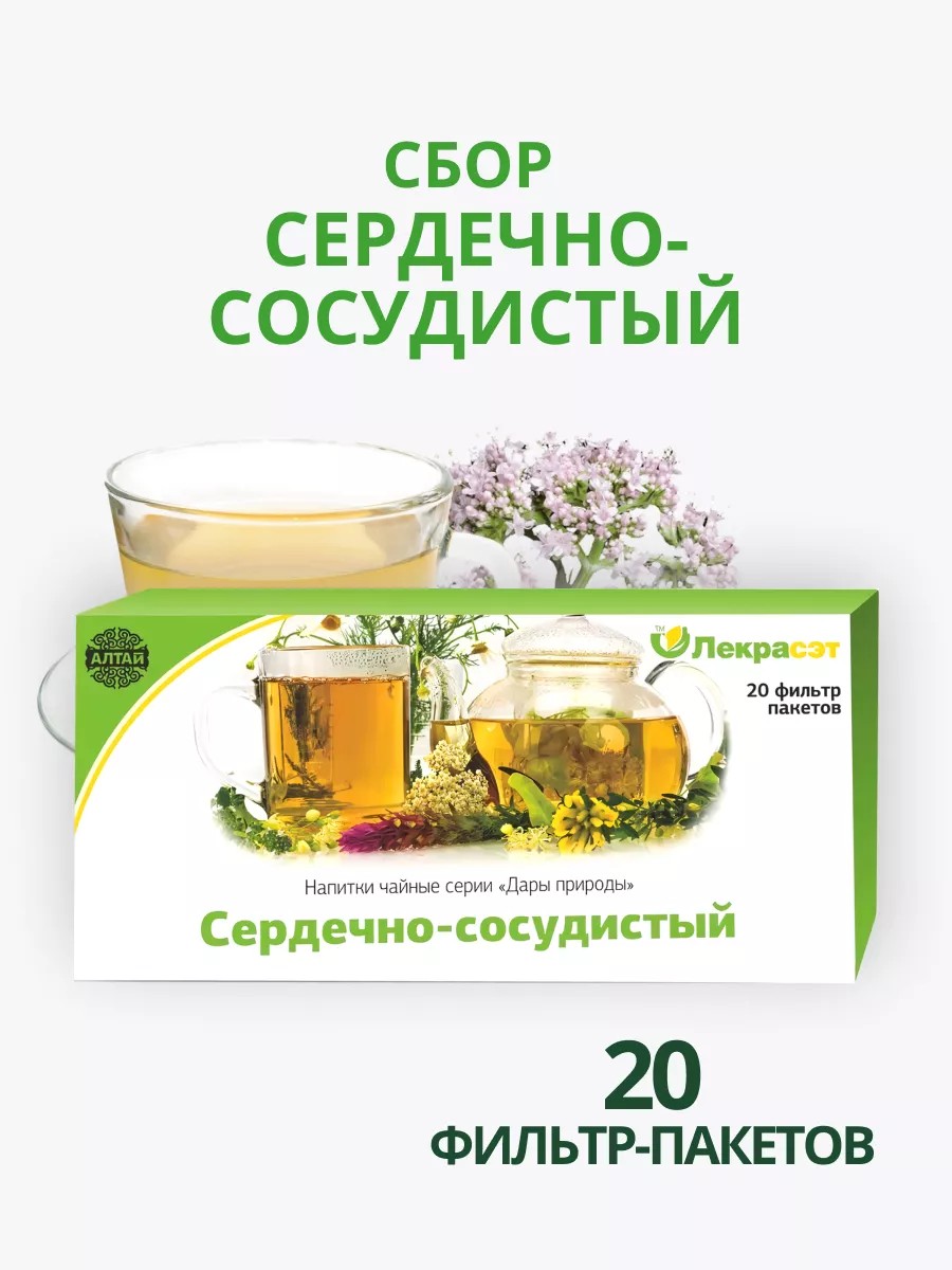 В сбор Сердечно-сосудистый входят плоды боярышника, известные своими свойствами благотворно влиять на работу сердца при сердечной недостаточности, связанной с различными сердечными заболеваниями, такими как атеросклероз, гипертония, аритмия. В сочетании с плодами боярышника и валерианой пустырник усиливает работу сердца. Сбор также действует успокаивающе на центральную нервную систему. Способ приготовления и применения: 2 фильтр-пакета залить стаканом горячей воды (200 мл) и настоять 30 мин. Принимать по 1/3 стакана 3 раза в день за