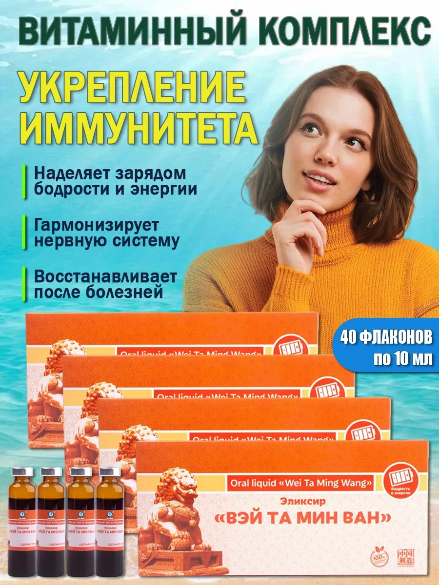 Наделяет человека зарядом бодрости и энергии, являясь природным витаминно-минеральным комплексом, восстанавливает и укрепляет после заболеваний. Повышает иммунитет, восстанавливает физическую активность и умственную работоспособность человека, улучшает настроение, приводит в гармонию нервную систему, качественно улучшает сон. Эликсир китайский «Вэй та мин ван» считается лучшим профилактическим препаратом. Натуральный витаминно-минеральный комплекс, идеально сбалансированный с помощью научных современных технологий. «Вэй та мин ван» воздействует на организм человека как общеукрепляющий, восстанавливающий и повышающий работоспособность человека. Препарат повышает бодрость и наделяет энергией в течение дня. Кроме этого препарат действует как природный имуномодулятор и гармонизатор умственной деятельности человека, улучшает ночное качество сна и поднимает настроение. Мягкий природный антиоксидант. Отлично снимает симптомы метеозависимости различной тяжести. Обладает мягким слабительным воздействием , является натуральным противокашлевым эликсиром. Повышает физическую, эмоциональную и умственную работоспособность, выстраивает естественную защиту от радио и химиотерапии. «Вэй та мин ван» питает энергией Ци желудок, селезенку, сердце, легкие. Успокаивает дух, увлажняет толстый кишечник и легкие. Состав препарата: мёд пчелиный; шиповник даурский (плоды). Плоды шиповника богаты витаминами С, В2, К, Р, Е, содержат сахара, дубильные и пектиновые вещества, лимонную кислоту и др. Мёд является источником простых углеводов, в нем представлены почти все витамины, целый набор минеральных веществ, органических кислот и ферментов. Показания к применению в период восстановления организма после заболеваний, травм, оперативных вмешательств; психоэмоциональных стрессов, умственного и физического перенапряжения; авитаминоз; синдром хронической усталости; для повышения устойчивости к стрессовым ситуациям; для улучшения умственной деятельности; при снижении аппетита, для улучшения пищеварения; для профилактики простудных заболеваний; в комплексном лечении сердечной недостаточности, атеросклероза; в комплексном лечении при заболеваниях легких. Способ применения: взрослым по 10мл 2 раза в день во время еды. Продолжительность приема – до 1 месяца. При отсутствии противопоказаний и нормальной переносимости препарата кратность приема может быть увеличена до 3 раз в день. В профилактических целях рекомендуется принимать по 10мл 2 раза в день курсами 2 раза в год (в осеннее-весенний период). Имеется осадок, перед употреблением взбалтывать! Противопоказания: индивидуальная непереносимость компонентов продукта, беременность, кормление грудью. Форма выпуска: 10 флаконов по 10 мл. Условия хранения: В сухом, прохладном месте. Срок годности: 2 года. Производитель: Харбинская пищевая корпорация «Гринспринг», КНР, г. Харбин, район Дунли, ул. Аньтунтоудао, д. 18.