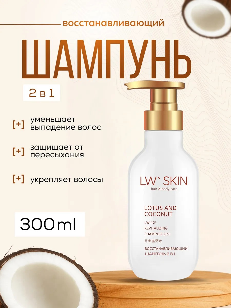 LW Skin Восстанавливающий шампунь 2в1, 300мл, LW-12. Особенности: мягко очищает волосы от загрязнений; укрепляет волосы по всей длине; защищает их от пересыхания и ломкости; придаёт им шелковистость и блеск; уменьшает склонность к истончению, повреждению и выпадению; волосы легко расчёсываются и укладываются без добавления кондиционера.