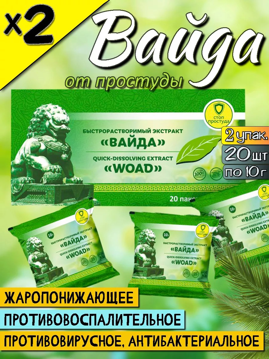 Woad extract has long been known in China as the best antipyretic. It acts specifically and in four ways: as an antipyretic, antiviral, and antibacterial agent, and also has excellent anti-inflammatory properties. The extract is effective in the acute phase: elevated temperature, severe headaches and sore throats. It promotes the rapid elimination of toxins. "Waida" is a Chinese medicine extract. It is used as an excellent antipyretic. "Waida" extract should be purchased at the first symptoms of a high temperature. "Waida" is very effective in the acute phase of any respiratory illness (headache, high fever, rash, sore throat, etc.). "Waida" removes toxins from the body. According to traditional Chinese medicine, "Waida" extract is recommended for fever reduction, detoxification, elimination of fever rashes, and overall cooling of the body. Ingredients: dyer's woad root. Indications for use: the initial period of acute respiratory diseases (including flu), accompanied by an increase in body temperature, symptoms of intoxication; tonsillitis, laryngitis and laryngospasm with high fever; conjunctivitis; aphthous stomatitis; the initial period of chickenpox, urticaria, mumps, erysipelas of the skin; as part of complex treatment in the initial period of acute infectious diseases (infectious mononucleosis, diphtheria, herpes zoster, epidemic meningitis and encephalitis, acute hepatitis, dysentery). Directions for use: dissolve 1/2 sachet or 1 sachet in 200 ml of warm boiled water and let cool to room temperature, adults take 3 times a day with meals. Duration of treatment is up to 3-5 days. For children and weakened patients, the dose is reduced by 2 times. Special precautions: While taking the medicine, it is not recommended to smoke, drink alcohol, or consume spicy, bitter, cold, raw, or fatty foods. It is ineffective for heavy, clear nasal discharge. Contraindications: hypersensitivity to any of the ingredients, pregnancy, or breastfeeding. Packing: 20 sachets of 10g each. Storage conditions: Store in a cool, dry place. Manufacturer: Harbin Greenspring Food Corporation, No. 18, Antongtou Road, Harbin, Dongli District, China.
