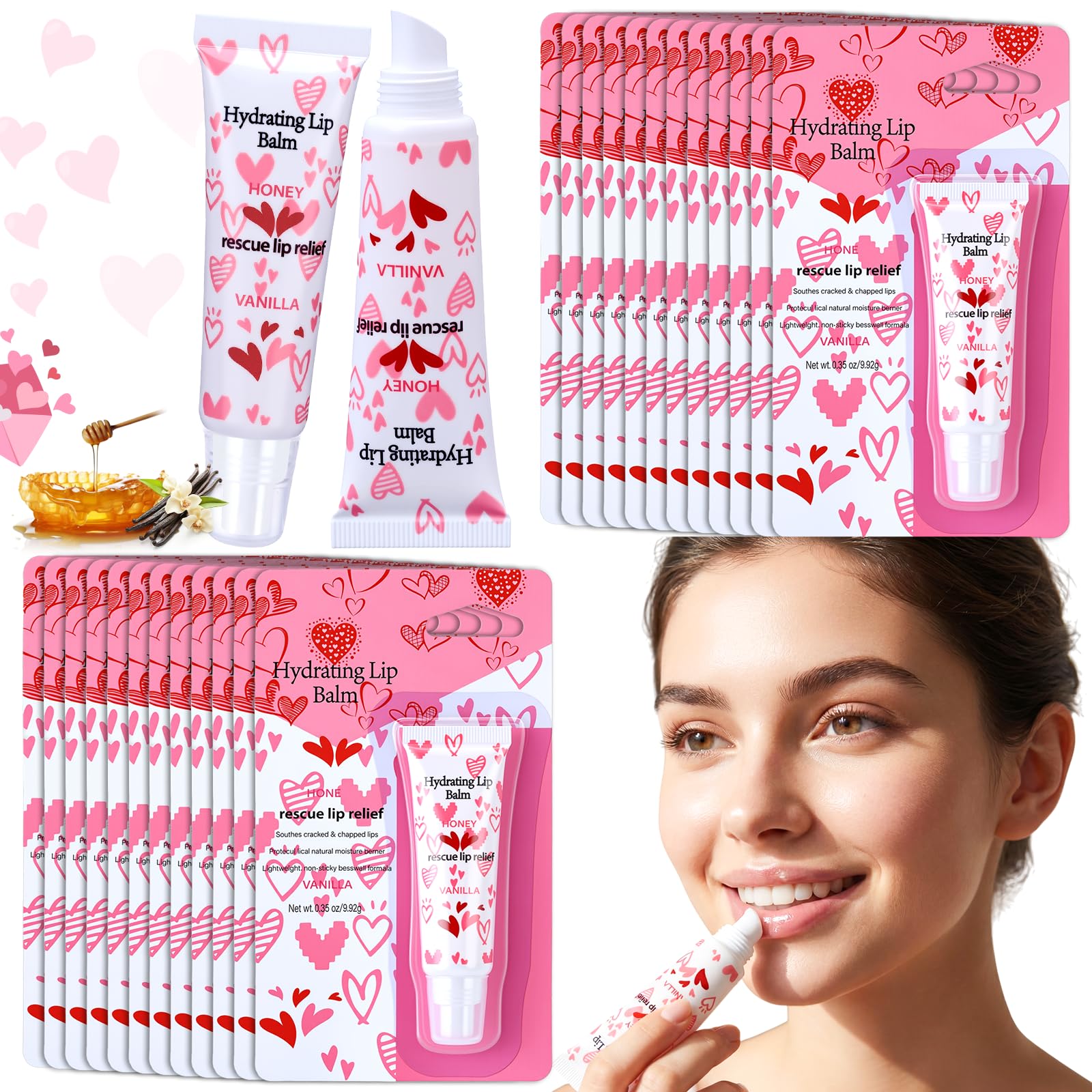 Features: For personal use or gift: The quantity pink gift valentines day packaging eliminates the need to choose between personal use and gifting. Pink Valentine's Day: The pink color evokes a romantic Valentine's Day atmosphere, making it suitable as a date gift or a souvenir for guests. Specifications: Material: beeswax, mineral oil, fragrance Color: pink Size: Back card is about 2.95 x 5.31 inches 7.5 x 13.5 cm Honey Vanilla Lip Balm is about 0.4 ounce 10 g Package includes: 12 x Honey Vanilla Lip Balm 12 x Back cards Notes: Manual measurement, please allow slight errors on size. The color may exist a slight difference due to different screen displays. Our product is not suitable for sensitive skin. Test whether there is any allergy on a small part of your skin before use. Please stop applying if there is any discomfort