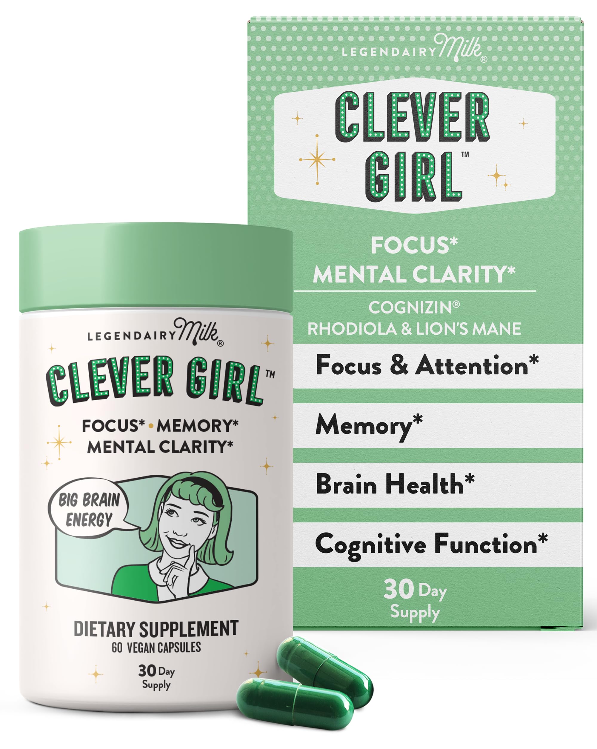 , : Trusted by millions of women around the world, Legendairy Milk was founded to support all women in all stages. Should you have any questions or concerns with your Clever Girl brain supplement purchase, please reach out to us so we can take care of you. , : Losing your train of thought mid-sentence? Tired and wired at the same time? Get to 3PM and your brain checks out before your body does? Clever Girl might be right for you!. - : Featuring well-studied ingredients proven for their cognitive benefits—because your mind deserves more than just caffeine. . - : Whether it's meetings, mom life, or multitasking mayhem, the Clever Girl focus supplement helps you stay on top of it with support for calm, clear focus. . : The nootropic supplement is powered by Cognizin Citicoline, Rhodiolife Rhodiola, and Lion's Mane to help support focus, memory, and mental clarity—so you can stay sharp, think on your feet, and power through your day. .