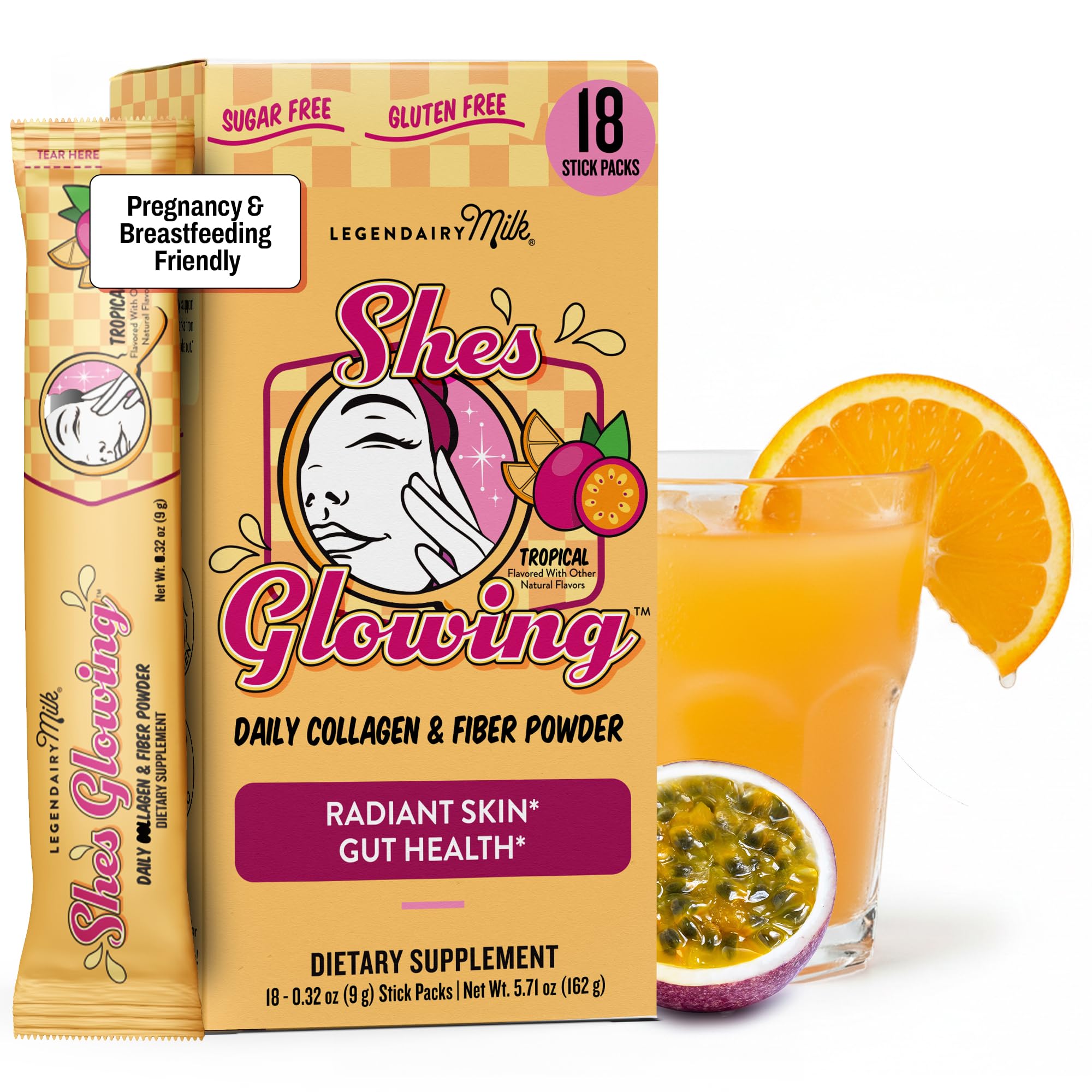 Glow from the inside out with She's Glowing, a daily Collagen Peptides and Prebiotic Fiber ritual designed for women who want radiant skin, a balanced gut, and confidence that lasts all day. This delicious Tropical stick pack blend combines clinically studied ingredients that support skin elasticity, the appearance of cellulite and fine lines, smoother digestion, and healthy regularity — all in one delicious drink. At the heart of She's Glowing is the powerful gut–skin connection. Solnul Prebiotic Fiber nourishes beneficial gut bacteria to support smoother digestion, balance, and regularity, helping your whole body feel more aligned from within. A happy gut sets the stage for a glow that reflects outward. To support visible skin benefits, VERISOL Collagen Peptides help promote collagen production, skin firmness, and elasticity — key factors in reducing the appearance of fine lines and cellulite. Paired with Dermaval Superfood Complex, which helps defend collagen and elastin from breakdown, plus Vitamin C and Hyaluronic Acid for hydration, you get comprehensive support for skin that looks smooth, firm, and naturally radiant. How to Mix for the Best Experience: Because She's Glowing contains both collagen and prebiotic fiber, it benefits from a little extra care during mixing to achieve the smoothest texture. Some light clumping or settling can be normal, especially when added all at once or mixed into very cold liquids — this does not affect quality or effectiveness. For best results, add 1 stick pack to 8–12 oz of water. Start by mixing the powder into lukewarm water (about ? of your total liquid) and stir or shake immediately to fully disperse the powder. Once blended, top off with cold water to reach your desired amount and mix again until smooth. A shaker bottle or handheld frother also works beautifully for an extra-smooth blend. If your drink sits, simply remix before sipping. Light foam from shaking or blending is normal and will settle quickly. Made for real life — and real women — She's Glowing is crafted with ingredients generally considered pregnancy, breastfeeding, and perimenopause-friendly, making it supportive through hormonal changes, postpartum recovery, or any season of life where you want to feel more like yourself. Each serving comes in a travel-friendly, mess-free stick pack, making it easy to enjoy your daily glow ritual at home or on the go. When your gut feels good, your skin follows — and when you feel balanced, confidence shines naturally. Let She's Glowing be the easiest (and most delicious) part of your self-care routine.2 - Consumption of Solnul Resistant Potato Starch Produces a Prebiotic Effect in a Randomized, Placebo-Controlled Clinical Trial (Nutrients, 2023), 3 - Dermaval inhibits glucose-induced neutrophil elastase activity in healthy subjects (Dovepress, 2013), 4 - Oral Intake of Specific Bioactive Collagen Peptides Reduces Skin Wrinkles and Increases Dermal Matrix Synthesis (Proksch et al., 2013), 5 - Dietary Supplementation with Specific Collagen Peptides Has a Body Mass Index-Dependent Beneficial Effect on Cellulite Morphology (Schunck et al., 2015. These statements have not been evaluated by the Food and Drug Administration. This product is not intended to diagnose, treat, cure, or prevent any disease. — - : Protect the glow you're building. Dermaval Superfood Complex helps defend collagen and elastin from breakdown, while Hyaluronic Acid and Vitamin C support hydration, smooth texture, and a naturally radiant finish. One powerful daily step toward skin that looks nourished and luminous. . - — - , - : Stop overcomplicating wellness. These delicious Tropical-flavored collagen and prebiotic fiber drink stick packs are easy to take anywhere. For best results, mix 1 stick pack into 8–12 oz of water, starting with lukewarm liquid and blending with a shaker bottle or frother, then remix as needed for a smooth, refreshing drink. No scooping, no mess — just grab, mix, and glow. . : From pregnancy and postpartum recovery to perimenopause and beyond, this daily collagen and fiber blend is made with ingredients generally considered pregnancy- and breastfeeding-friendly. Support skin resilience, digestion, and overall wellness through hormonal changes — so you can feel more like yourself again. . — : A glowing complexion starts in the gut. Solnul Prebiotic Fiber, backed by 25 clinical studies, has been shown to deliver a 200 increase in beneficial gut bacteria, supporting digestion, balance, and regularity. Because this formula contains fiber, mixing with a little extra care helps deliver the smoothest experience — a small step that makes a big difference. . ' — : VERISOL Collagen Peptides have also been shown to deliver up to a 65 increase in skin collagen after 8 weeks and support a reduced appearance of cellulite over time. This is collagen that helps your body rebuild from within — not just sit on the surface. . — : In clinical studies, VERISOL Collagen Peptides have been shown to support up to 32 reduction in the appearance of wrinkles and fine lines and 10 improvement in skin elasticity in as little as 4 weeks — helping your skin look smoother, firmer, and more resilient from the inside out. . ? She's Glowing collagen drink mix by Legendairy Milk is a delicious daily Collagen Peptides and Prebiotic Fiber powder designed to support visibly smoother skin, gut health, and an inside-out glow. This 18-count carton of Tropical stick packs mixes into 8–12 oz of water, smoothies, or juice — easily blended using a shaker bottle or handheld frother for a smooth, refreshing drink. .