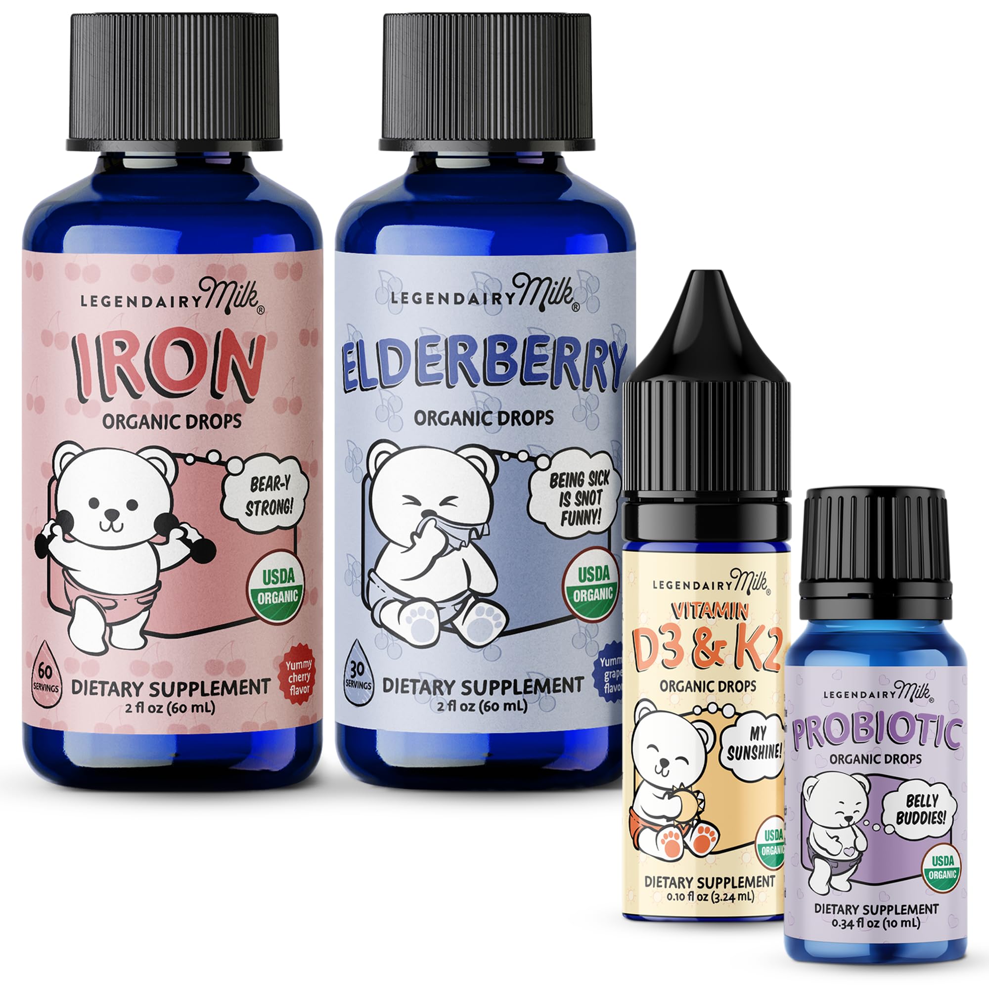 This complete wellness bundle brings together four essential liquid supplements from Legendairy Milk to support your baby's daily nutritional routine. Featuring Vitamin D3 K2 drops, elderberry immune drops, probiotic drops, and liquid iron, this bundle helps parents cover key areas of growth, digestion, and immune support with clean, organic formulas designed for infants and toddlers.