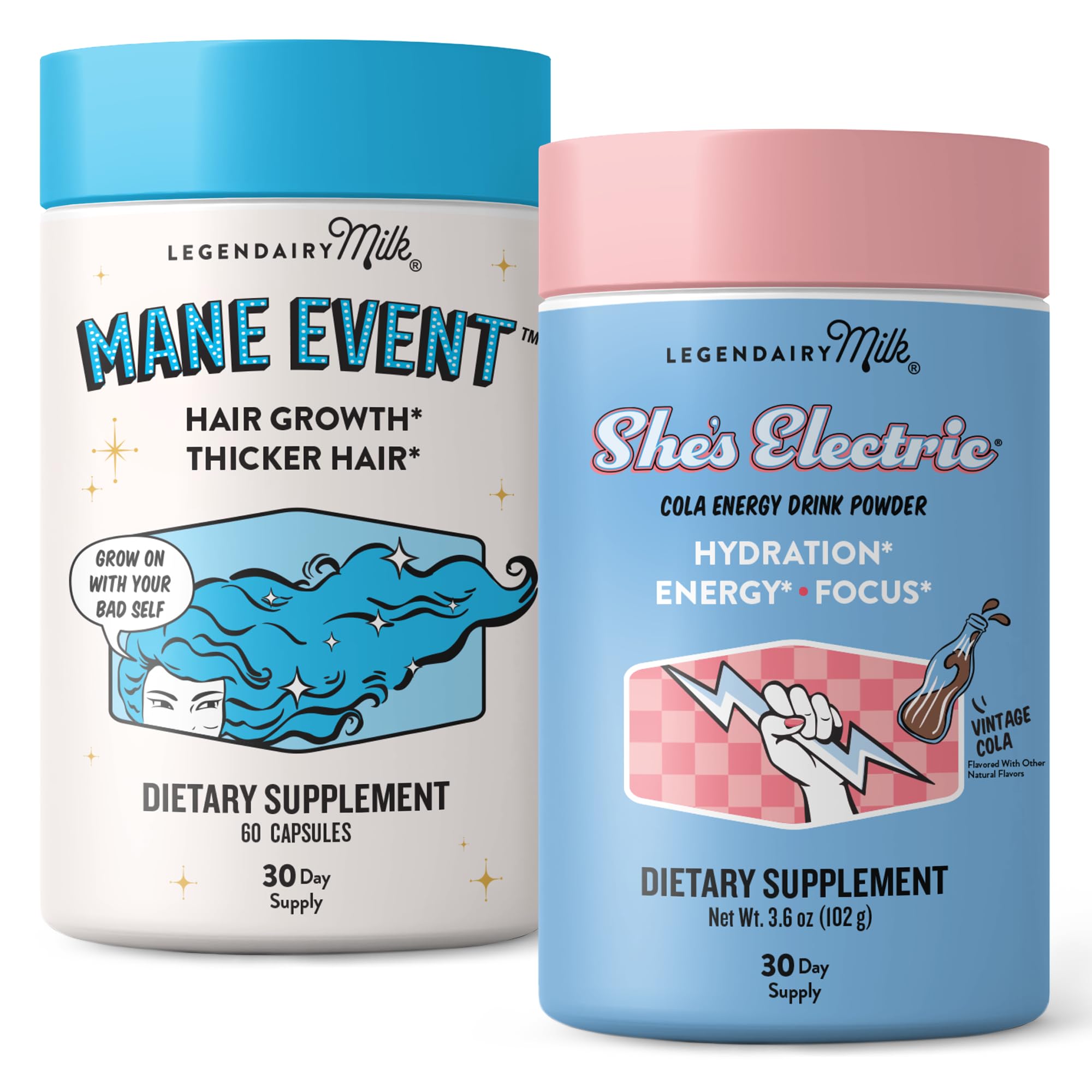 Looking good starts with feeling energized. The Legendairy Milk Mane Event She's Electric bundle is designed to support thicker, fuller-looking hair while delivering clean, steady energy and hydration—without sugar, crashes, or jitters. This powerful women's wellness duo supports beauty, performance, and confidence from the inside out. Mane Event Hair Growth Vitamins for Women are formulated with 10,000 mcg of biotin (magnesium biotinate), a multi-collagen complex featuring five collagen types, keratin peptides, and clinically studied Lustriva, an ingredient shown in women to support hair thickness, density, shine, and smoother-looking skin. This advanced beauty supplement works from within to support women experiencing hair thinning, shedding, postpartum changes, or lack of fullness, helping promote stronger, healthier-looking hair over time. She's Electric Clean Energy Electrolyte Drink Mix complements Mane Event by supporting steady energy, mental clarity, hydration, and endurance. Formulated with 50 mg of natural caffeine from green tea, electrolytes, magnesium citrate, vitamins B6 and B12, and zinc, this sugar-free, calorie-free energy drink mix helps fuel busy days, workouts, and mental focus—without the crash associated with sugary sodas or high-stimulant energy drinks. Together, this bundle supports a holistic approach to women's wellness, combining hair growth support with clean energy and hydration in one simple daily routine. Take 2 Mane Event capsules daily to support hair growth and enjoy 1 serving of She's Electric daily for clean energy and hydration. Perfect for mornings, workouts, or replacing sugary beverages. Made by Legendairy Milk, a women-founded brand trusted by millions, both products are gluten-free, Non-GMO, and made in the USA in cGMP-certified facilities. Whether you're powering through workdays, workouts, or motherhood, this bundle supports beauty and energy—without compromise.Simple Daily Beauty Energy Routine: Take 2 Mane Event capsules daily to support hair growth and enjoy 1 serving of She's Electric daily for clean energy and hydration. Clean, women-founded formulas made in cGMP-certified facilities you can trust. Sugar-Free Calorie-Free Energy Drink Mix: Enjoy a refreshing cola-flavored energy powder with zero sugar and zero calories—perfect for replacing sugary sodas, pre-workout drinks, or afternoon pick-me-ups. Simply mix with sparkling water for a bubbly and refreshing guilt-less treat,. Hydration, Endurance Daily Performance Support: Formulated with electrolytes, magnesium citrate, B vitamins, and zinc to support hydration, physical endurance, and daily stamina for busy women, workouts, and active lifestyles. Clean, Steady Energy Without Jitters or Crash: She's Electric provides 50 mg natural caffeine from green tea to support sustained energy, focus, and mental clarity—without sugar, artificial sweeteners, or the crash common with traditional energy drinks. Supports Thicker, Fuller-Looking Hair for Women: Mane Event hair growth vitamins deliver 10,000 mcg biotin, multi-collagen peptides, keratin, and clinically studied Lustriva to support hair thickness, density, shine, and stronger strands for women experiencing thinning or shedding.