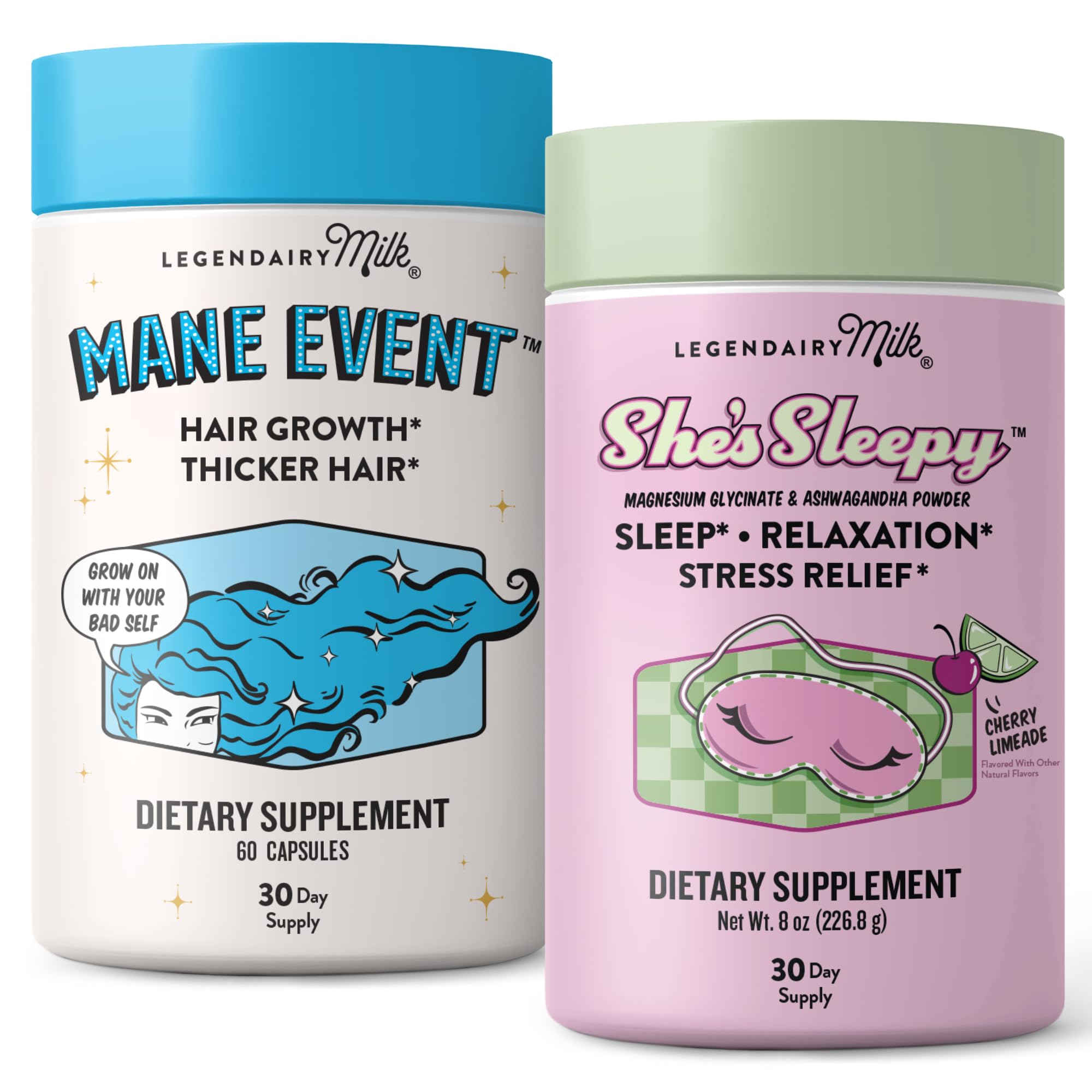 Great hair depends on great sleep. The Legendairy Milk Mane Event She's Sleepy bundle supports thicker, fuller-looking hair while promoting restful sleep, relaxation, and nighttime recovery—key foundations for overall women's wellness and beauty. Mane Event Hair Growth Vitamins for Women are formulated with 10,000 mcg of biotin (magnesium biotinate), a multi-collagen complex with five collagen types, keratin peptides, and clinically studied Lustriva, an ingredient shown in women to support hair thickness, density, shine, and smoother-looking skin. This science-backed beauty supplement supports women experiencing hair thinning, shedding, postpartum changes, or lack of fullness by working from within. She's Sleepy Magnesium Sleep Drink complements Mane Event by supporting relaxation, stress balance, and restful sleep without melatonin. Formulated with magnesium glycinate, magnesium citrate, ashwagandha, tart cherry, L-theanine, and passionflower, this nightly drink mix supports falling asleep, staying asleep, and waking refreshed—without habit-forming ingredients. Together, this bundle creates a day-to-night women's wellness system, supporting hair growth during the day and recovery at night. Take 2 Mane Event capsules daily to support hair growth and enjoy 1 serving of She's Sleepy in the evening as part of a calming nighttime routine. Both products are made by Legendairy Milk, a women-founded brand trusted by millions, and are Non-GMO, gluten-free, and manufactured in cGMP-certified facilities in the USA.Simple AM PM Routine: Take 2 Mane Event capsules daily for hair growth support and enjoy 1 serving of She's Sleepy nightly for relaxation and sleep support—clean, women-founded formulas you can trust. Sleep Supports Beauty Recovery: Quality sleep supports your body's natural recovery processes, which play a role in hormone balance, stress management, and the conditions needed for healthy hair growth. Melatonin-Free Nighttime Support: Designed for gentle, non-habit-forming nightly use to support relaxation, stress balance, and sleep quality without melatonin. Promotes Restful, Relaxing Sleep: She's Sleepy magnesium sleep drink supports falling asleep, staying asleep, and waking refreshed with magnesium glycinate, magnesium citrate, ashwagandha, tart cherry, and calming botanicals. Supports Thicker, Fuller-Looking Hair: Mane Event hair vitamins deliver high-potency biotin, multi-collagen peptides, keratin, and clinically studied Lustriva to support hair thickness, density, shine, and strength for women experiencing thinning or shedding.