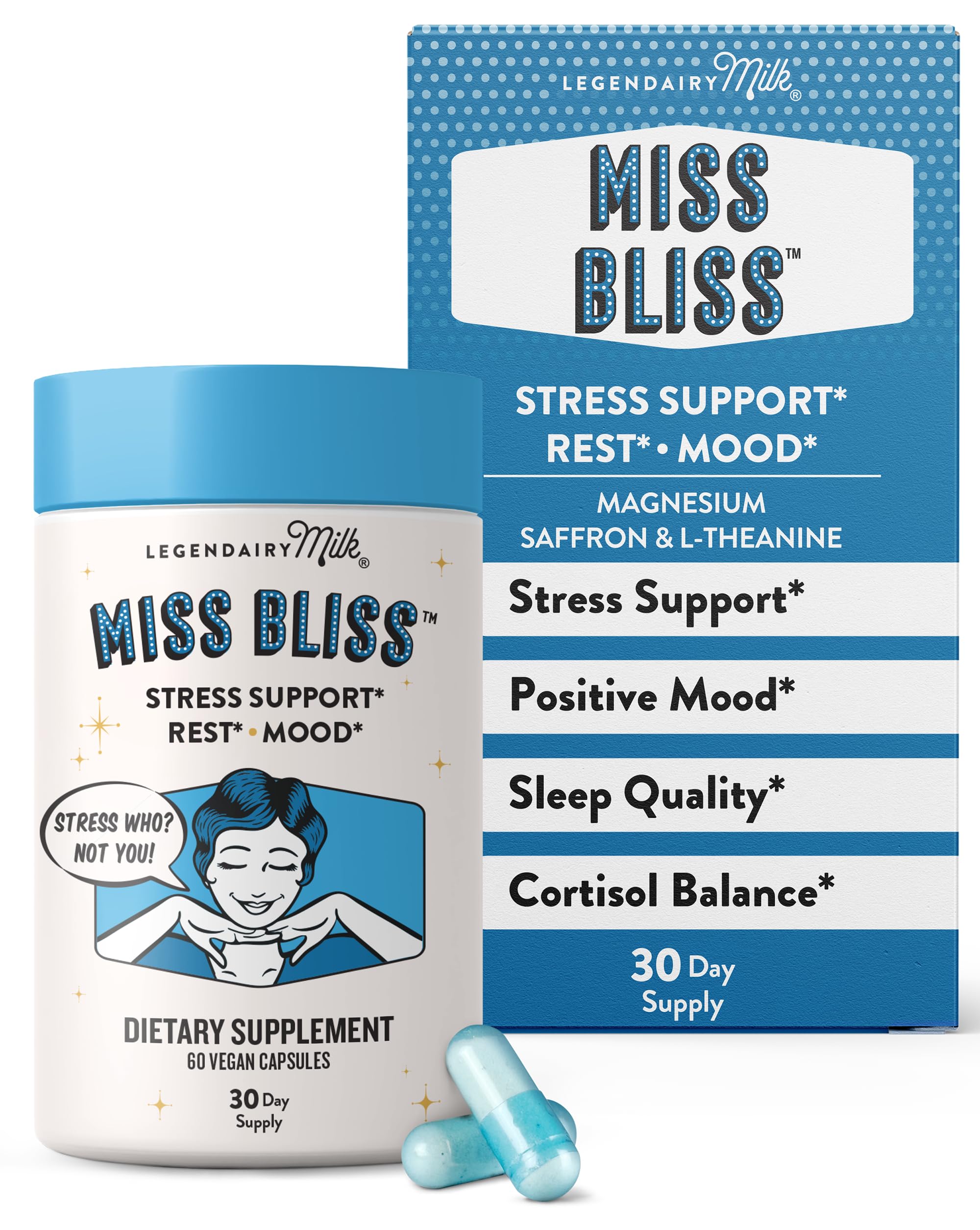 Women-Focused Wellness: Legendairy Milk products are designed by women, for women, to support well-being across all stages of life. If you have questions about your Miss Bliss stress supplement experience, we're here to help. Day-to-Night Support: This formula is designed for daily use to help you feel balanced throughout the day and relaxed in the evening—non-drowsy and suitable for ongoing wellness routines. . Research-Inspired Ingredients: Saffron and L-Theanine are included based on emerging research supporting their role in emotional wellness. . Magnesium for Relaxation: Includes Magnesium Glycinate and Magnesium Citrate, two highly absorbable forms that help support muscle relaxation and a sense of calm. . Daily Balance Formula: Miss Bliss is formulated with Saffron, Magnesium, and L-Theanine to help support mood, calmness, and overall well-being—morning to night. .