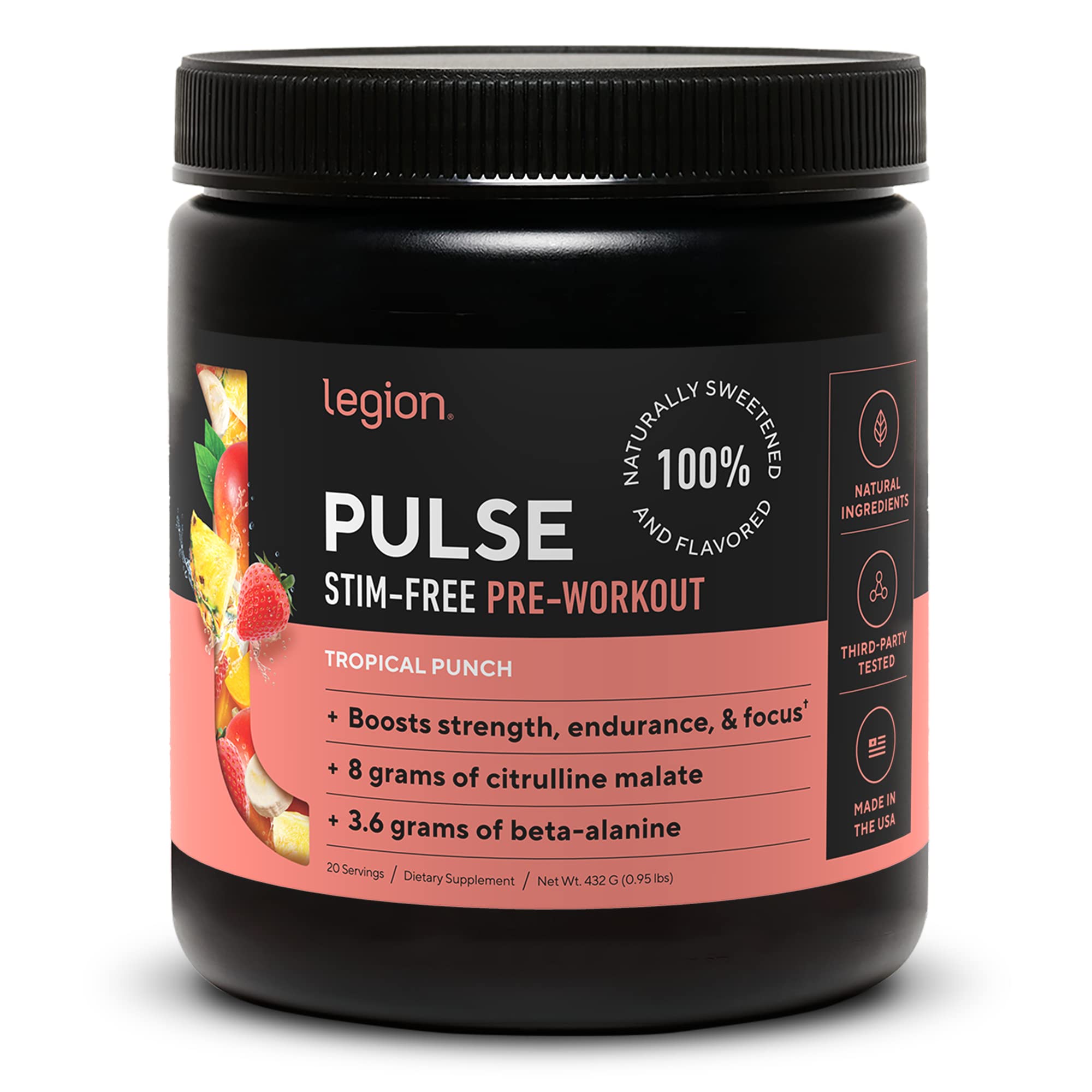 LEGION Pulse Pre Workout Supplement - All Natural Nitric Oxide Preworkout Drink to Boost Energy Creatine Free Naturally Sweetened Beta Alanine Citrulline Alpha GPC (Caffeine Free Tropical Punch)