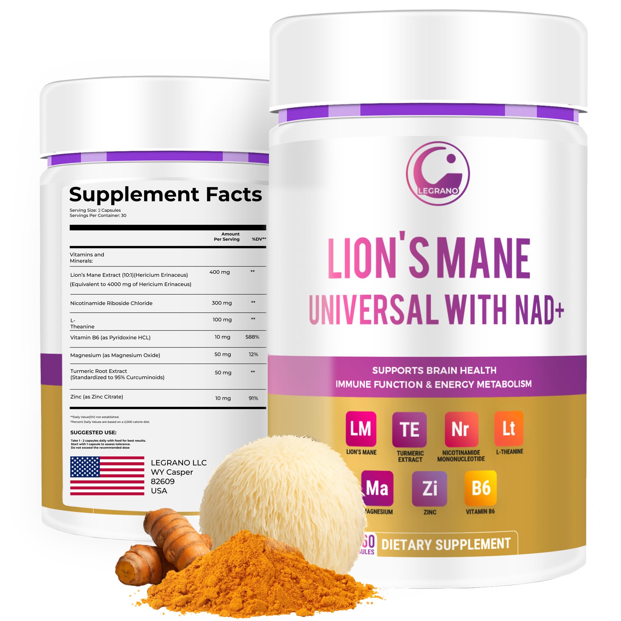 LEGRANO Lion s Mane Capsules & NAD+ Supplement with Nicotinamide Riboside (NR) L-Theanine Magnesium Zinc Vitamin B6 & Turmeric Energy Formula for Focus & Brain Health
