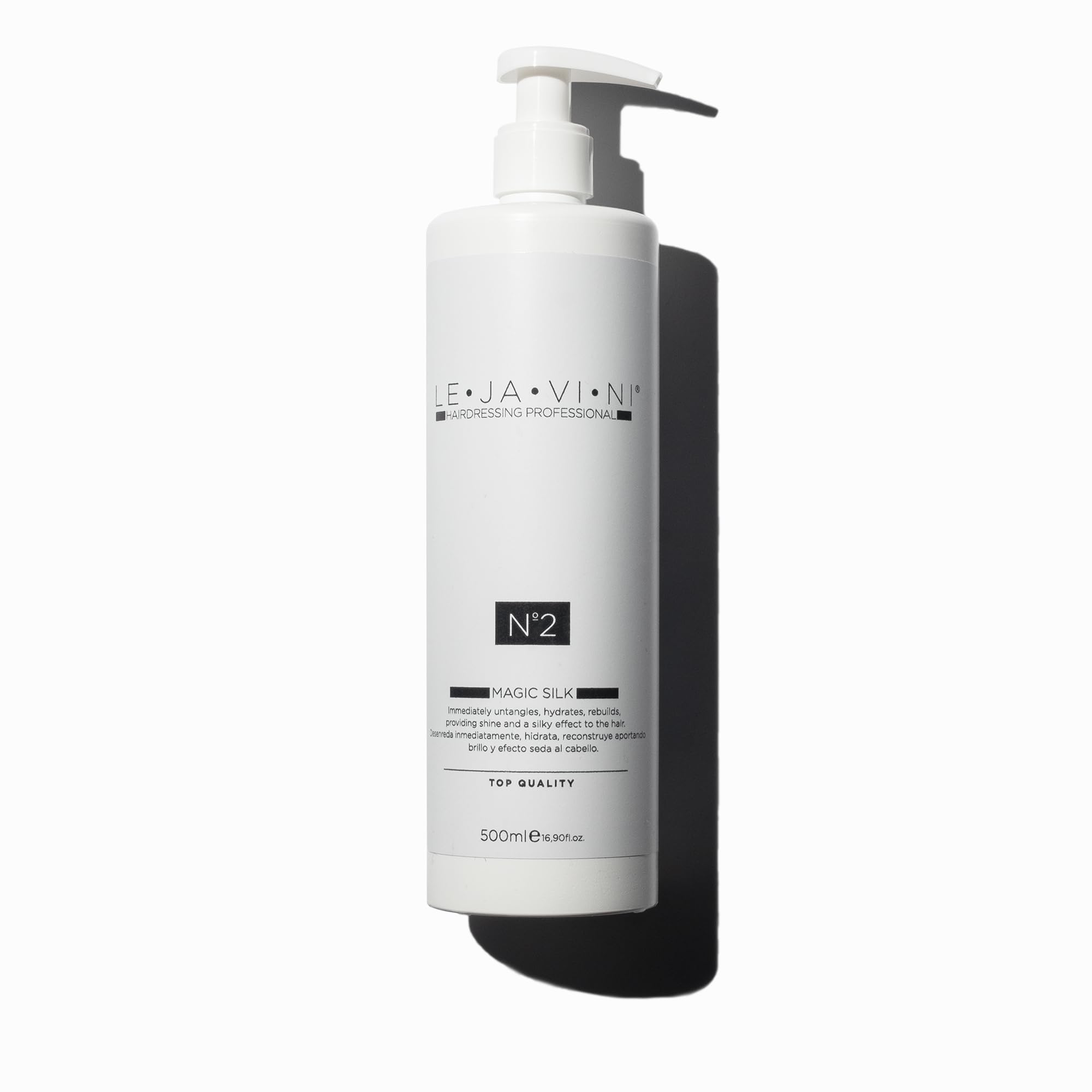 Lejavini N2 Magic Silk is a leave-in hair mask without rinsing for professional use, developed for the care, better combability and suppleness of the hair from the first use. The creamy leave-in formula with silk proteins is ideal for dry, damaged or unruly hair. With its anti-frizz effect and light texture, it helps control frizz, add shine and make hair easier to style - with a well-groomed finish. Particularly suitable for curly, wavy or difficult to tie hair. Supports the elasticity and definition of curls, without weighing the hair down. The moisturizing care cream can be used on damp or dry hair – ideal for uncomplicated use in everyday life or in the salon. It can be easily distributed without being rinsed. Lejavini Magic Silk is the daily care solution for anyone who wants supple, well-groomed and frizz-free hair, easy to use, with visible effect. INSTRUCTIONS FOR USE Apply to damp or dry hair, massage and distribute evenly. Do not rinse. Use 500 ml per application.Professional leave-in application for every day, quick and easy to use – on damp or dry hair. Ideal for daily care at home or as a finish in the salon. Conditioner for defined curls strengthens and shapes curls, improves elasticity and gives fine or dry hair more volume and definition. Anti-frizz and better manageability helps smooth rebellious hair and gives a soft finish with silky shine. Particularly suitable for curly or wavy hair. Deep effective moisture and suppleness with silk proteins and nourishing ingredients that nourish hair without weighing it down or leaving residue. Leave-in mask with professional effect, caring leave-in cream that hydrates, nourishes and improves combability from the first use. Ideal for dry, damaged or unruly hair.Lejavini Nr. 2 Magic Silk Moisturizer, Ontwarrend, 500 ml Lejavini N2 Magic Silk is een leave-in-haarmasker zonder uitspoelen voor professioneel gebruik, ontwikkeld voor de verzorging, betere kambaarheid en soepelheid van het haar vanaf het eerste gebruik. De romige leave-in-formule met zijdeproteïnen is ideaal voor droog, beschadigd of weerbarstig haar. Met zijn anti-kroeseffect en lichte textuur helpt het kroes te controleren, glans te geven en het haar gemakkelijker te stylen - met een verzorgde afwerking. Bijzonder geschikt voor krullend, golvend of moeilijk vast te binden haar. Ondersteunt de elasticiteit en definitie van krullen, zonder het haar te verzwaren. De vochtinbrengende verzorgingscrème kan op vochtig of droog haar worden gebruikt – ideaal voor ongecompliceerd gebruik in het dagelijks leven of in de salon. Hij kan gemakkelijk worden verdeeld zonder te worden uitgespoeld. Lejavini Magic Silk is de dagelijkse verzorgingsoplossing voor iedereen die soepel, verzorgd en kroezvrij haar wenst, eenvoudig in gebruik, met zichtbaar effect. GEBRUIKSAANWIJZING Op vochtig of droog haar aanbrengen, inmasseren en gelijkmatig verdelen. Niet uitspoelen. Gebruik 500 ml per toepassing.Professionele leave-in-toepassing voor elke dag, snel en eenvoudig te gebruiken – op vochtig of droog haar. Ideaal voor de dagelijkse verzorging thuis of als finish in de salon. Conditioner voor gedefinieerde krullen, versterkt en vormt krullen, verbetert de elasticiteit en geeft fijn of droog haar meer volume en definitie. Anti-kroes en betere kapbaarheid helpt rebels haar glad te maken en geeft een zachte afwerking met zijdeachtige glans. Bijzonder geschikt voor krullend of golvend haar. Diepe effectieve vochtigheid en soepelheid met zijdeproteïnen en voedende ingrediënten die het haar voeden zonder te verzwaren of resten achter te laten. Leave-in-masker met professionele werking, verzorgende leave-in-crème, die het haar vanaf het eerste gebruik hydrateert, verzorgt en de kambaarheid verbetert. Ideaal voor droog, beschadigd of weerbarstig haar.