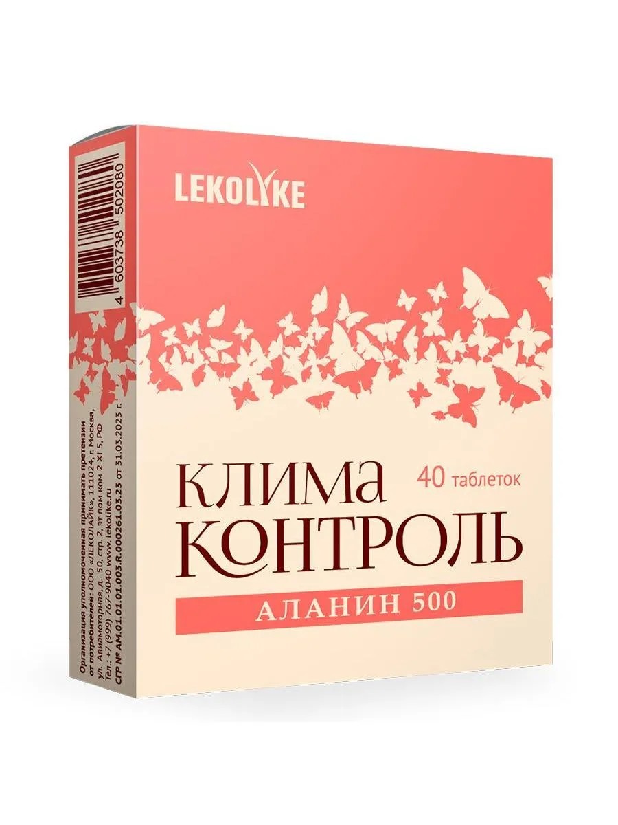 lekolike климаконтроль аланин 500 n40 табл по 700мг. способствует сохранению нормальной температуры кожи, снижению частоты и интенсивности приливов в период менопаузы. в качестве биологически активной добавки к пище - дополнительный источник витамина е, источник бета-аланина. бета-аланин, целлюлоза микрокристаллическая – агент антислеживающий, диоксид кремния– агент антислеживающий, магниевая соль стеариновой кислоты – агент антислеживающий, желатин. для реализации населению в качестве биологически активной добавки к пище – дополнительного источника витамина е, источника аланина (бета-аланина).