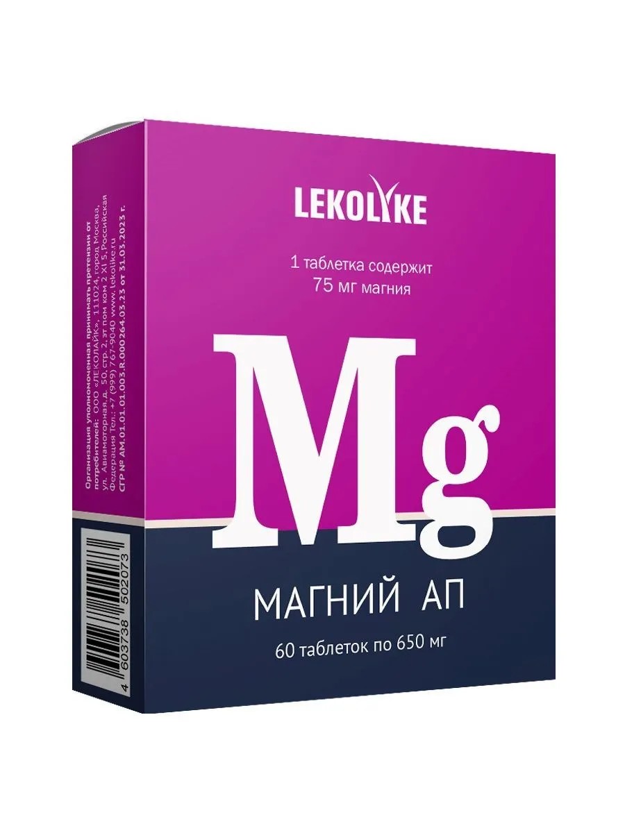 lekolike магний ап n60 табл по 650мг. способствует повышению уровня стрессоустойчивости, улучшению функционального состояния органов и систем организма, профилактике преждевременного старения, устранения дефицита магния. в качестве биологически активной добавки к пище - дополнительный источник магния. магния цитрат, агенты антислеживающие - целлюлоза микрокристаллическая, диоксид кремния, кальциевая соль стеариновой кислоты (агенты антислеживающие). для реализации населению в качестве биологически активной добавки к пище – дополнительного источника магния.