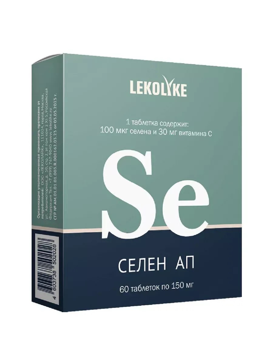 LEKOLIKE СЕЛЕН АП - Биологически активная добавка (БАД) к пище - создан для защиты организма от свободных радикалов. Рекомендуется в качестве биологически активной добавки к пище - дополнительного источника витамина С и селена.Способствует: • повышению антиоксидантной защиты организма и иммунитета, в т.ч. в «сезон простуд»; • улучшению работы сердечно-сосудистой, эндокринной и репродуктивной систем; • замедлению процессов старения; • защите организма от токсического воздействия тяжелых металлов.В отличие от классических антиоксидантов, СЕЛЕН АП не только предотвращает образование новых перекисей, но и нейтрализует ранее образовавшиеся.А также проявляет высокую антиоксидантную активность как в липидной (жировой), так и водной средах организма.В основе механизма работы биологически активной добавки СЕЛЕН АП лежит действие 2-х активных компонентов:• Селен. Является одним из 13 жизненно важных минералов, необходимых для здоровья человека, в том числе селен необходим для активации глутатионпероксидазы - важнейшего фермента антиоксидантной системы организма. СЕЛЕН АП содержит "Селексен" - единственный из известных антиоксидантов, содержащих биодоступный и нетоксичный селен.• Витамин С - выполняет биологические функции восстановителя и кофермента большого количества метаболических процессов, происходящих в организме, в том числе представляет 2 линию антиоксидантной системы организма.РЕКОМЕНДЦИИ ПО ПРИМЕНЕНИЮ:Взрослым по 1 таблетке 1 раз в день во время еды.Продолжительность приема: 1 месяц.При необходимости курс приема можно повторить.Содержание в 1 таблетке (суточной дозировке):Селен - 100 мкг, Витамин С - 30 мг.
