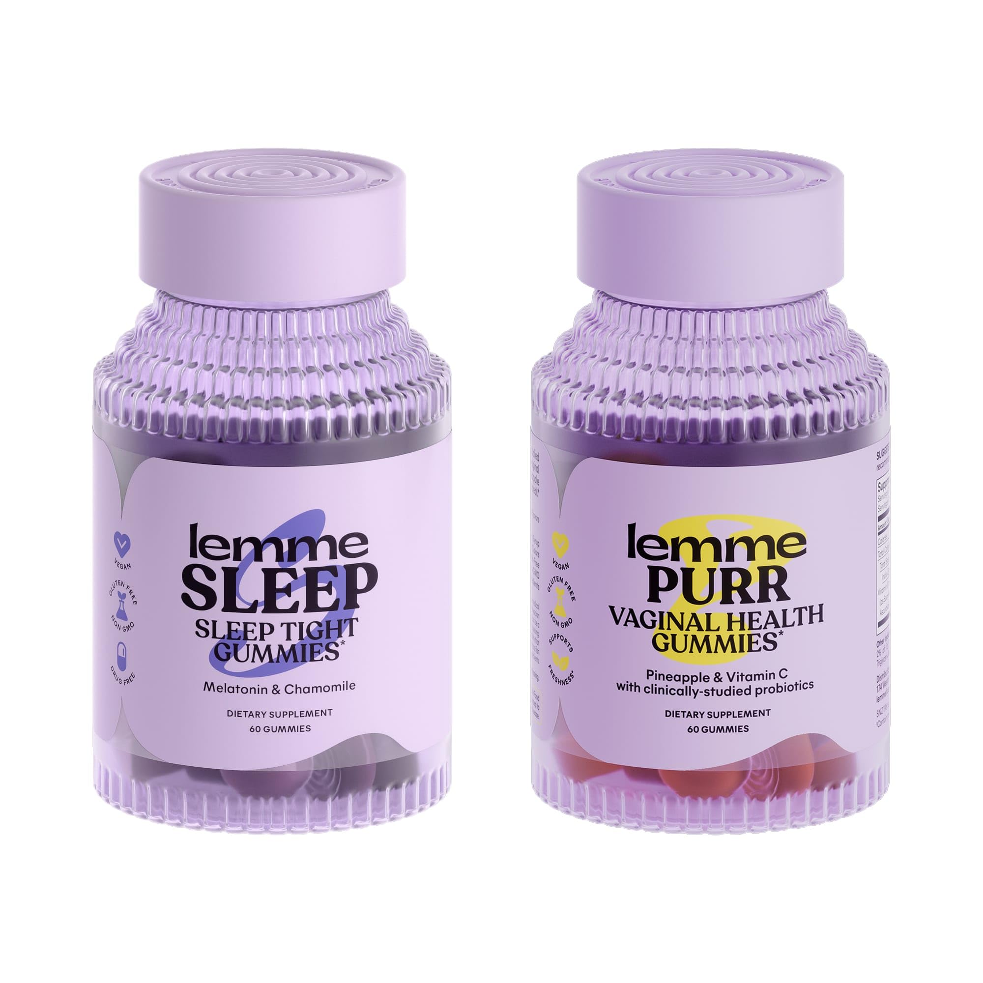 "Lemme Sleep helps you fall asleep, stay asleep, and wake up feeling refreshed with a proprietary blend of Melatonin, Magnesium, L-Theanine, and calming botanicals. Lemme Sleep is non-habit-forming, drug-free, and supports healthy sleep patterns. Keep it balanced: Lemme Purr is a breakthrough feminine health gummy with clinically-studied ingredients that support vaginal health, pH levels, odor, and healthy vaginal flora. Expertly formulated with a leading, clinically tested probiotic strain (SNZ-1969). Each gummy also contains antioxidants, Vitamin C, and real pineapple. Lemme Purr offers 3-in-1 benefits for vaginal, digestive and immune system health. Lemme Purr is vegetarian, non-GMO, gluten-free, dairy-free, and formulated without corn syrup, artificial sweeteners, or synthetic colors. These statements have not been evaluated by the Food and Drug Administration. This product is not intended to diagnose, treat, cure, or prevent any disease."TRUSTED INGREDIENTS: Vegetarian, gluten gelatin-free, non-GMO. No corn syrup or synthetic colors. Made in USA, in cGMP certified facility, locally globally sourced ingredients. . 3-in-1 SUPPORT for VAGINAL, DIGESTIVE and IMMUNE SYSTEM HEALTH: Just 2 gummies per day to support a healthy vaginal microbiome, gut health and immune system health. . SUPPORTS FEMININE HEALTH: Lemme Purr is an innovative women's health probiotic gummy formulated to support vaginal health, freshness, odor and healthy pH levels with 1 Billion CFUs of clinically-studied probiotic strain SNZ-1969. Plus antioxidant Vitamin C and 100 mg of real pineapple per serving. . HEALTHY SLEEPING PATTERNS: Our proprietary herbal blend of Chamomile, Lavender, Elderberry is expertly formulated to let you drift off in peace. Botanicals work synergistically with our other ingredients to promote healthy sleep. . SLEEP TIGHT: Lemme Sleep uses a premium, science-backed formulation including 5mg of Melatonin per serving, a natural hormone of sleep-wake cycles to help you fall asleep, stay asleep and wake up feeling refeshed. .