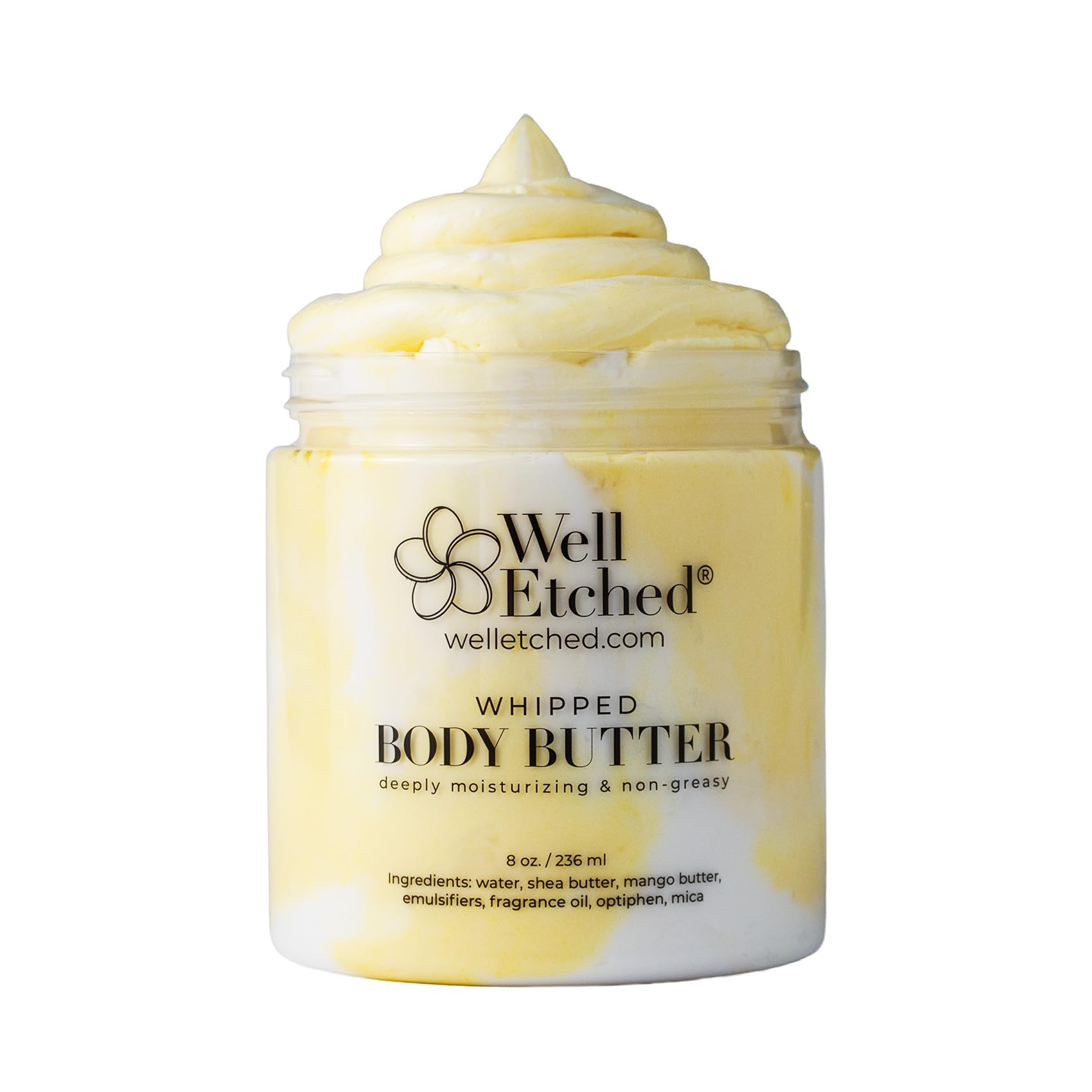 Body Butter makes a thoughtful gift or stocking stuffer!. No-Return No-Refund Policy. For Hygiene and Safety Reasons, all sales are final. If you have any questions or concerns, please reach out. I'm here to help and I want you to love your purchase. Do not eat. For external use only. Handmade With Intention - Each batch is made by hand, by me, using high-quality 100 raw butters, top-tier ingredients, and fine fragrance oils (premium ingredients do make a difference). Your skin deserves the best!. INGREDIENTS: water, shea butter, mango butter, emulsifiers, stearic acid (emulsifier and skin softener), optiphen (preservative), fragrance oils, mica (color). Lemon Meringue smells amazing! Sweet and tart. Never Greasy, absorbs quickly for soft glowing skin. The Original Well Etched Non-greasy Body Butter. Made by Hand, Made for Skin. You're going to love this stuff! Not your typical body butter. Unbelievably smooth and non-greasy. My triple-whipped emulsified formula absorbs quickly and leaves your skin deeply moisturized. Made with simple skin-loving ingredients, it's a treat for dry, itchy, dull skin.