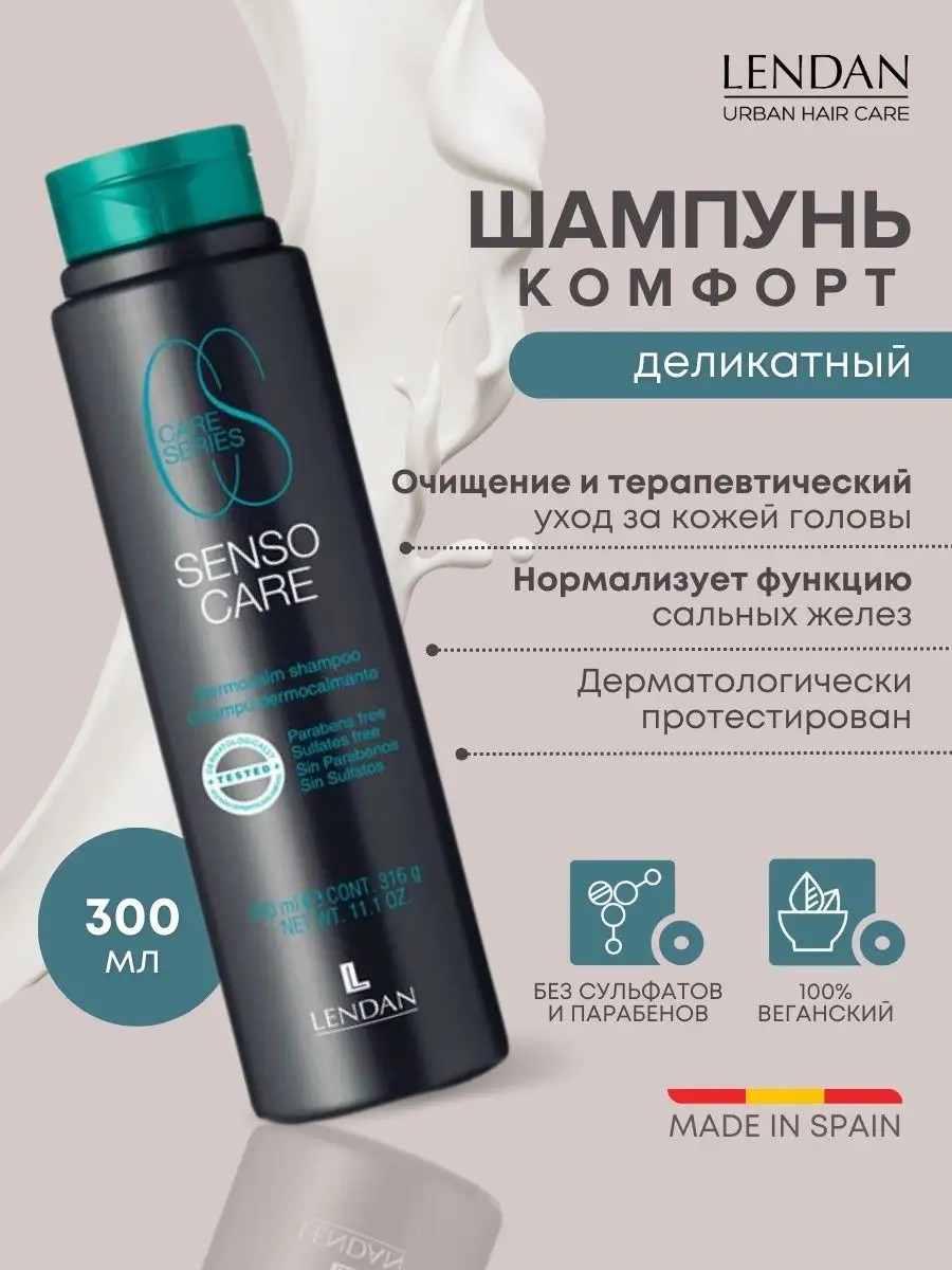 Organic cosmetics: sulfate-free, hypoallergenic, gentle, comforting shampoo for women's hair, paraben-free, medicated. Professional care: LENDAN CS Senso Care Dermocalm Shampoo by Salerm Cosmetics, 300 ml. Dryness, flaking, inflammation, and other skin discomforts are not only unpleasant but also negatively impact the condition of your hair. To quickly address and treat these issues, the brand has created a special, professional, antifungal product with a surprisingly gentle cleansing base for dandruff, hair loss, seborrhea, and scalp crusting. This antifungal care product does not contain harsh parabens/SLS compounds, fragrances, or dyes that can cause allergic reactions. It consists of derivatives of natural oils and foaming plant extracts. With Comfort Shampoo, your scalp not only receives thorough cleansing but also strengthening care, thickening, and intensive hydration for the roots. Skin becomes completely healthy, elastic, and relieved of any discomfort. A caring, nourishing, and thickening herbal complex of vitamins and medicinal plant extracts improves the condition of your locks, strengthens and smoothes them, thickens, makes them thicker and more visibly fuller, and imparts a soft shine. This gentle, sulfate-free shampoo provides unrivaled comfort while relaxing the scalp. Specially formulated for sensitive scalp care, this shampoo offers: A gentle cleansing base free of harsh chemicals. A therapeutic treatment for detoxifying, restoring, and moisturizing the scalp. It normalizes sebaceous gland function and strengthens the natural lipid mantle for healthy, supple, and comfortable skin. The complex strengthens the scalp and adds shine. Ingredients and their properties: Aloe vera extract moisturizes the skin and reduces inflammation. Thyme extract is a natural antiseptic that protects the skin from bacteria and fungi, relieves itching, and soothes irritation. Sage leaf extract helps normalize sebaceous gland function, eliminates dandruff, and relieves inflammation. Green tea extract has antioxidant properties, protects hair from damage, and promotes growth and density. This deep cleansing shampoo is suitable for curly, brittle, frizzy, normal, dry, and fine-ended hair. Our product is suitable for girls, women (women's care), and men (men's care). With prolonged use, your locks will instantly receive compliments for their beauty! Directions: Apply shampoo to damp hair, lather, and rinse thoroughly with water. Use regularly for best results.