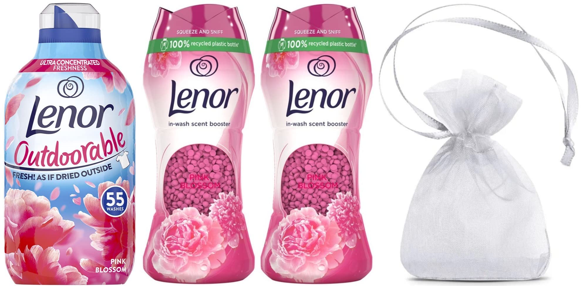 The Pink Blossom Fragrance by Lenor has a new and rosy scent characterized by apple blossom brightness, sweet melon and warm amber. Enjoy freshness as if you’ve dried your clothes outside, even when you dry inside! Thanks to its innovative technology, you just need a small dose to get that line dried feeling, whatever the weather. With the Outdoorable Fabric Conditioner protects your fabrics from fading, bobbling and stretching in the wash. Lenor Outdoorable was developed together with consumers to recreate the outdoor freshness and it keeps releg freshness when fabrics are just dried, stored in the cupboard and even when you’re moving.+ Lenor In-Wash Scent Boosters provides up to 12 weeks of boosted freshness (in storage), so your clothes stay fresher for longer. That's because the beads go in at the start of the wash, allowing more scent to slowly infuse into your fabrics as they wash. Can be used on all colors, fabrics, and loads, even in cold wash. Personalize the scent intensity by choosing the quantity of beads you want to use. Lenor In-Wash Scent Boosters provides up to 12 weeks of boosted freshness in storage, so your clothes stay fresher for longer. Pour beads directly into the empty drum then add detergent, clothes, and fabric conditioner as usual. An irresistible freshness boost for even more of the scent you love. INGREDIENTS 5-15% Cationic Surfactants Perfumes Alpha-Isomethyl Ionone Benzyl Salicylate Citronellol Coumarin Geraniol Hexyl Cinnamal Limonene Linalool, Delta-Damascone, Linalool, Hexyl cinnamal, Tetramethyl Acetyloctahydronaphthalenes, (E/Z)-ethyl 2-acetyl-4-methyltridec-2-enoate. + Perfumes, Alpha-Isomethyl Ionone, Citronellol, Hexyl Cinnamal, Hydroxyisohexyl 3-Cyclohexene Carboxaldehyde, Limonene, Linalool DIRECTIONS Use Lenor Outdoorable safely, always read the product information before use. Poor 14 ml dose into your washing machine drawer for amazing freshness. Liquid fabric softener can increase fabric flammability. + Pour beads directly into the empty drum before your laundry. Personalize the scent intensity by choosing the quantity of beads you want to use. SAFETY WARNING Keep away from children. Keep away from eyes. If product gets into eyes rinse thoroughly with water. IF SWALLOWED: Immediately call a doctor. Keep away from sunlight and heating more than 30°C.Liquid fabric softener can increase fabric flammability. Using more than recommended can increase this effect. Do not use this product: On children's sleepwear or garments labeled as flame resistant as it may reduce flame resistance. May produce an allergic reaction. See moreThe Pink Blossom Fragrance by Lenor has a new and rosy scent characterized by apple blossom brightness, sweet melon and warm amber. Enjoy freshness as if you’ve dried your clothes outside, even when you dry inside!. Lenor In-Wash Scent Boosters provides up to 12 weeks of boosted freshness in storage, so your clothes stay fresher for longer. Pour beads directly into the empty drum then add detergent, clothes, and fabric conditioner as usual. An irresistible freshness boost for even more of the scent you love. Lenor Outdoorable's ultra-concentrated formula provides 55washes in a small bottle. Thanks to its innovative technology, you just need a small dose to get that line dried feeling, whatever the weather. The Outdoorable Fabric Conditioner protects your fabrics from fading, bobbling and stretching in the wash. Our Gift For You - Organza bag. Using 9 x 7 x 0.1 cm mini bag are made of special sheer organza, which are very durable, touch softly and smoothly. You can store your tiny items whilst celebrating festivals like wedding, Christmas, graduation, and party. Bundle Pack.