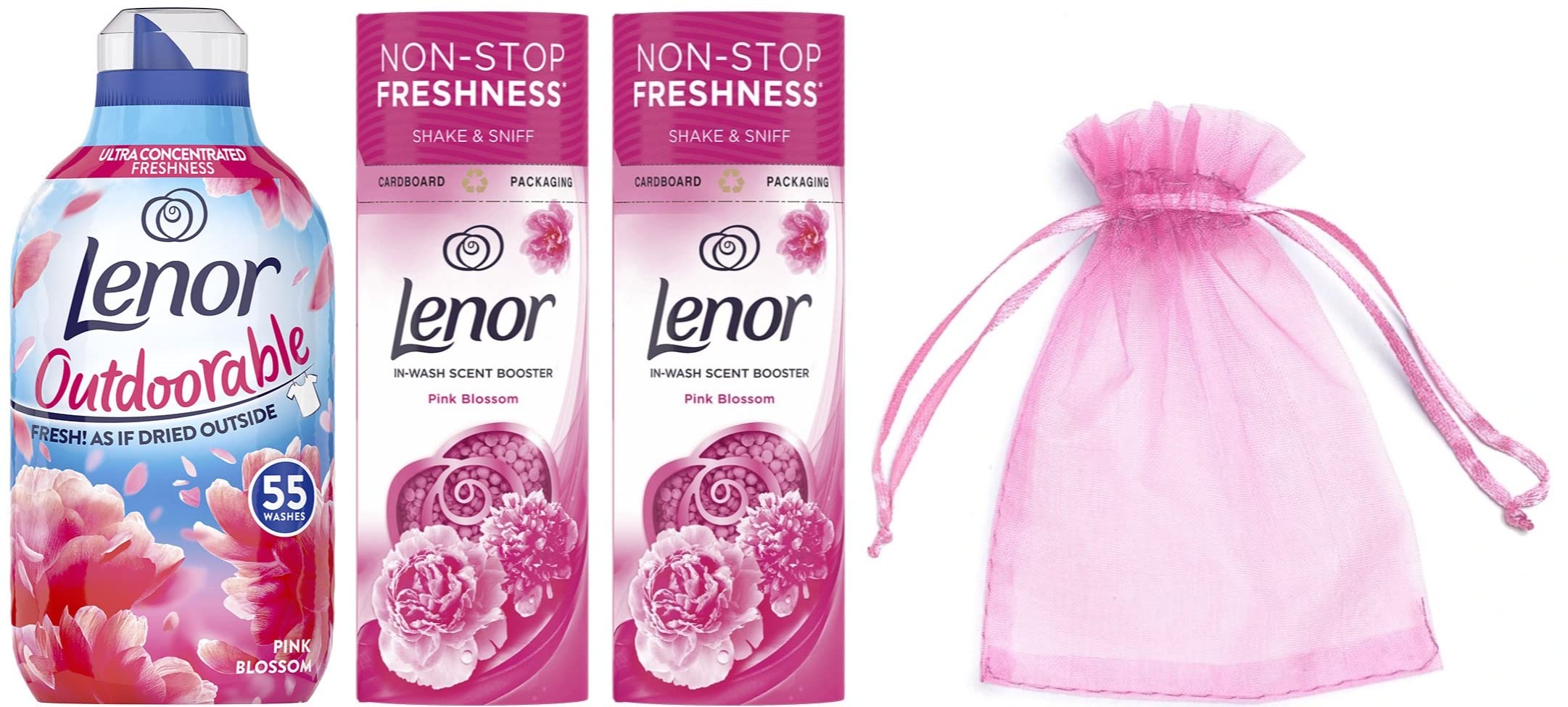 Enjoy freshness as if you've dried your clothes outside, even when you dry inside! Lenor Outdoorable's freshness is ultra-concentrated versus other Lenor fabric conditioners, so you just need a small dose to get that line dried feeling, whatever the weather! Lenor Outdoorable was developed together with consumers to recreate the outdoor freshness and it keeps releg freshness when fabrics are just dried, stored in the cupboard and even when you're moving. Protects from fading, bobbling and stretching in the wash. Bottle made of 100 recycled (excluding cap, spout and sleeve) and recyclable (excl. sleeve) plastic. Lenor In-Wash Scent Boosters provides up to 12 weeks of boosted freshness (in storage), so your clothes stay fresher for longer. An irresistible freshness boost for even more of the scent you love. That's because the beads go in at the start of the wash, allowing more scent to slowly infuse into your fabrics as they wash. Can be used on all colors, fabrics, and loads, even in cold wash. Personalize the scent intensity by choosing the quantity of beads you want to use. Pour beads directly into the empty drum then add detergent, clothes, and fabric conditioner as usual. Lenor in wash scent booster now comes in a moisture resistant, recyclable CARDBOARD PACK. INGREDIENTS 5-15 Cationic Surfactants Perfumes Alpha-Isomethyl Ionone Benzyl Salicylate Citronellol Coumarin Geraniol Hexyl Cinnamal Limonene Linalool, Delta-Damascone, Linalool, Hexyl cinnamal, Tetramethyl Acetyloctahydronaphthalenes, (E Z)-ethyl 2-acetyl-4-methyltridec-2-enoate. Perfumes, Alpha-Isomethyl Ionone, Citronellol, Hexyl Cinnamal, Hydroxyisohexyl 3-Cyclohexene Carboxaldehyde, Limonene, Linalool DIRECTIONS Use Lenor Outdoorable safely, always read the product information before use. Poor 14 ml dose into your washing machine drawer for amazing freshness. Liquid fabric softener can increase fabric flammability. Pour beads directly into the empty drum before your laundry. Personalize the scent intensity by choosing the quantity of beads you want to use. SAFETY WARNING READ BEFORE USE THE LABELS, WARNING AND INSTRUCTION PROVIDED WITH THE PRODUCT AND RETAIN THESE IMPORTANT SAFETY INSTRUCTIONS FOR FUTURE REFERENCE. May produce an allergic reaction. Keep out of reach of children. IF ON SKIN: Wash with plenty of water. IF SWALLOWED: Rinse mouth. Do NOT induce vomiting. Immediately call a POISON CENTER doctor. Never soak or wash above 50 C. Keep away from sunlight and heating more than 30 C. Harmful to aquatic life with long lasting effects. See moreThe Pink Blossom Fragrance by Lenor has a new and rosy scent characterized by apple blossom brightness, sweet melon and warm amber. Enjoy freshness as if you've dried your clothes outside, even when you dry inside!. Lenor In-Wash Scent Boosters provides up to 12 weeks of boosted freshness in storage, so your clothes stay fresher for longer. Pour beads directly into the empty drum then add detergent, clothes, and fabric conditioner as usual. An irresistible freshness boost for even more of the scent you love. Lenor Outdoorable was developed together with consumers to recreate the outdoor freshness and it keeps releg freshness when fabrics are just dried, stored in the cupboard and even when you're moving. Our Gift For You - Organza bag. Using 9 x 7 x 0.1 cm mini bag are made of special sheer organza, which are very durable, touch softly and smoothly. You can store your tiny items whilst celebrating festivals like wedding, Christmas, graduation, and party. Bundle Pack PACKING MAY VARY.