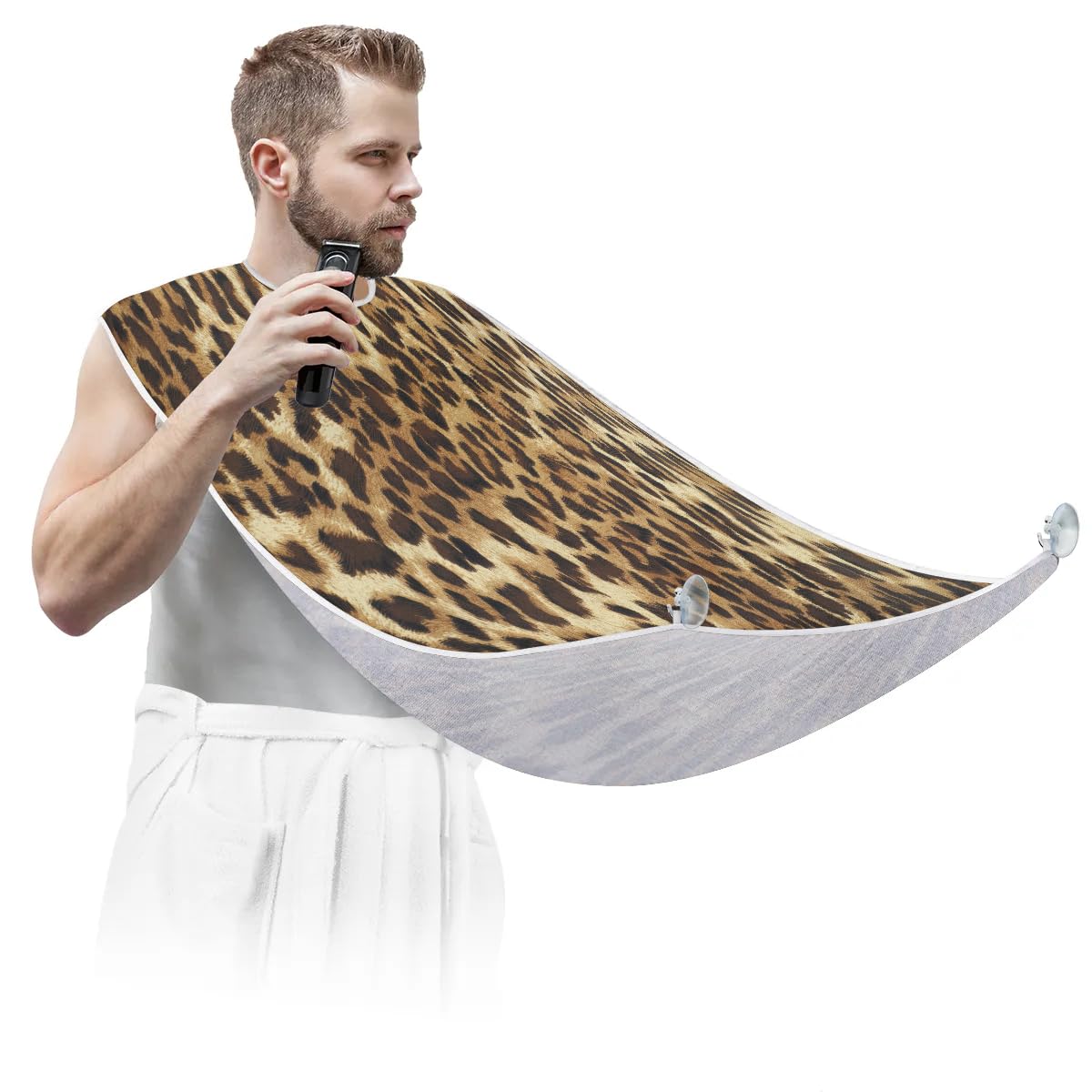 fiber fabric, ensuring exceptional quality. The fabric has a smooth and soft surface that is not sticky to hair, making it comfortable to wear during grooming sessions. It is also waterproof and anti-static, further enhancing its practicality. In addition, it is equipped with two high-quality suction hooks that provide powerful suction without leaving marks on mirrors or tiles. ?Convenient and Easy to Use?: Using our beard hair catcher is a breeze. Just fasten it around your neck using the adjustable strap and secure it to the mirror. Once in place, you can effortlessly proceed with your regular grooming routine. When you're done, simply remove the beard bib from the suction cups. Then brush the collected hair into the trash can for easy cleanup. ?Effortless Hair Cleanup?: Our Leopards Skin Print beard bib is expertly designed to capture all loose beard hair, mustache, and sideburn trimmings, providing effortless cleanup and keeping your sink immaculately clean. This saves you valuable time that would otherwise be spent on tedious cleaning tasks. Not only does it serve a practical function, but it also adds a stylish touch to your daily grooming routine.