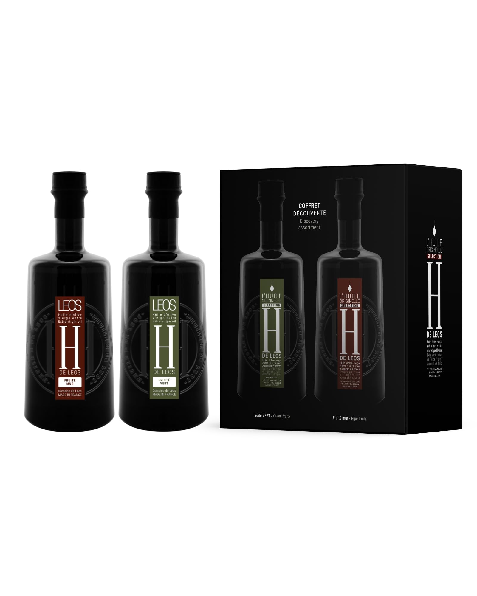 A GIFT SET OF 2 BOTTLES, ONE "GREEN FRUITY" AND THE OTHER "RIPE FRUITY," PERFECT FOR GIVING OR PLACING ON THE TABLE FOR LOVERS OF AROMATIC OILS. MULTI-AWARD-WINNING AND FAVORITED BY TOP FRENCH CHEFS. Since their launch in December 2019, these two H de Leos olive oils have received 29 international awards and accolades, including 12 gold medals. - DISCOVER THE AROMATIC SUBTLENESS AND UNIQUE TASTE OF AN "ORIGINAL" RIPE FRUITY, MULTI-AWARD-WINNING AND LOVED BY GREAT CHEFS. If you are looking for extra virgin olive oils with great aromatic subtlety and the sweetness of a truly ripe fruity oil (low bitterness and low heat), this exceptional extra virgin oil, with its aromas of ripe almond and fruit, is for you! And you will find that it perfectly embodies the spirit of excellence, authenticity, and unique character of Domaine Leos oils. - DISCOVER THE AROMATIC POWER AND UNIQUE TASTE OF AN "ORIGINAL" GREEN FRUITY, MULTI-AWARD-WINNING AND LOVED BY TOP CHEFS. If, like top chefs, you're looking for oils with exceptional aromatic power and a truly fruity green taste with a fresh, natural zest and a remarkably subtle bitterness, this extra virgin olive oil is for you. You'll find that it perfectly embodies the spirit of excellence, authenticity, and unique character of Domaine Leos olive oils.LEOS - Coffret Cadeau 2 Huiles d'Olive - H DE LEOS - Fruité Vert et Fruité Mûr - Vierge Extra - 2x100ml - MultimédailléesDESCRIPTION DU PRODUIT UN COFFRET-CADEAU DE 2 BOUTEILLES EN "FRUITÉ VERT" ET "FRUITÉ MÛR" À OFFRIR OU À METTRE SUR UNE TABLE POUR LES AMOUREUX D'HUILES AROMATIQUES, MULTIMÉDAILLÉES ET AIMÉES PAR DES GRANDS CHEFS FRANÇAIS. Depuis leur lancement en décembre 2019, ces deux huiles d'olive H de Leos ont reçu 29 prix ou reconnaissances internationales dont 12 médailles d'or. - DÉCOUVREZ LA SUBTILITÉ AROMATIQUE ET LE GOÛT UNIQUE D'UN FRUITÉ MÛR « ORIGINEL », MULTIMÉDAILLÉE ET AIMÉE PAR LES GRANDS CHEFS Si vous recherchez des huiles d'olive vierge extra possédant une grande subtilité aromatique et la douceur d'un vrai Fruité mûr (peu amères et peu ardentes), cette huile vierge extra d'exception, qui possède des arômes d'amande mûre et de fruits, est faite pour vous ! Et vous pourrez constater qu'elle s'inscrit parfaitement dans l'esprit d'excellence, l'authenticité et le caractère unique des huiles du Domaine Leos. - DÉCOUVREZ LA PUISSANCE AROMATIQUE ET LE GOUT UNIQUE D'UN FRUITÉ VERT « ORIGINEL », MULTIMÉDAILLÉE ET AIMÉE PAR LES GRANDS CHEFS Si vous recherchez comme les grands chefs des huiles possédant une très grande puissance aromatique et un vrai goût de fruité vert à "l'ardence fraiche", naturelle, avec une amertume d'une grande finesse, cette huile vierge extra est faite pour vous. Et vous pourrez constater qu'elle s'inscrit parfaitement dans l'esprit d'excellence, l'authenticité et le caractère unique des huiles d'olive du Domaine Leos.
