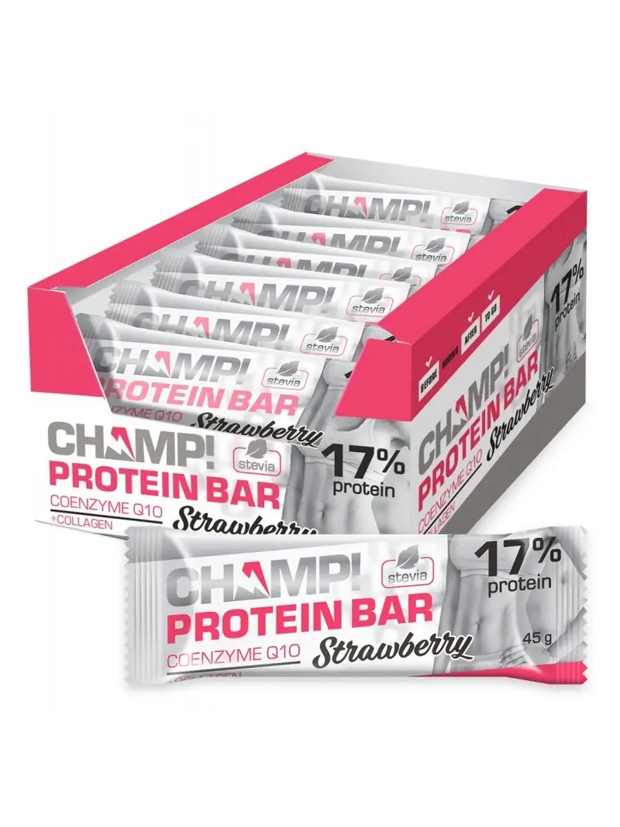 КомплектацияБатончик клубничный протеиновый Champ 18шт упаковки