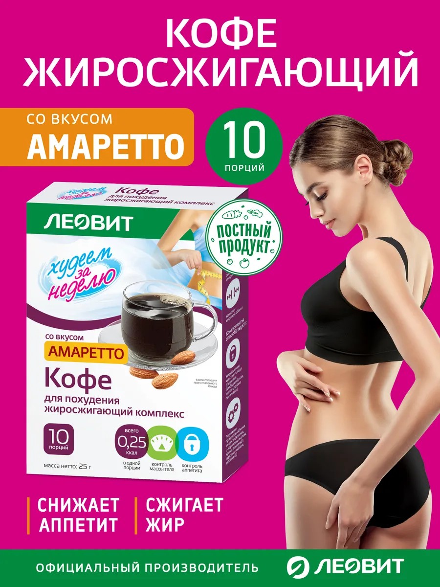 Кофе для похудения жиросжигающий комплекс растворимый амаретто. 10 пакетов по 2,5 г. Леовит Капучино со вкусом Амаретто - наслаждение с пользой для фигуры. Напиток прекрасно подойдет тем, кто придерживается поста или вегетарианского питания - ведь в его составе нет продуктов животного происхождения. Только отборный кофе, эффективные жиросжигающие компоненты и тонкий аромат Амаретто.Кофе для похудения не только заряжает бодростью и дарит важные утренние минуты наедине с собой, но и содержит компоненты, способствующие регуляции жирового обмена (L-карнитин, хрома пиколинат, инулин, пряности), снижению избыточной массы тела (L-карнитин, гарциния камбоджийская) и снижению аппетита (гарциния камбоджийская, хрома пиколинат, инулин). Если вы хотите добиться еще лучших результатов в процессе похудения - замените вкусным капучино один из приемов пищи. Или дополните рацион другими эффективными продуктами для снижения веса из серии "Худеем за неделю".Нас так же ищут: программа питания, программа для похудения, программа питания для похудения, программа питания для похудения и снижения веса, похудение, худеем вместе, я худею, домашнее похудение.