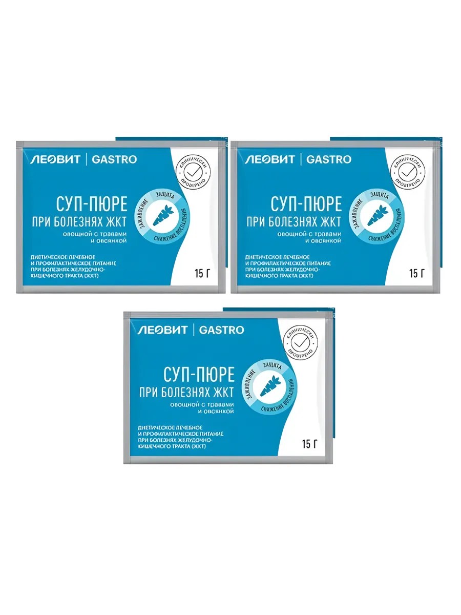 Leovit gastro vegetable puree soup with herbs and oatmeal is a specialized dietary therapeutic and preventative nutritional product used for gastrointestinal diseases, helping to reduce inflammation and promote healing of the stomach and intestinal mucosa. The prepared puree soup has a color characteristic of its ingredients, as well as dark inclusions characteristic of St. John's wort, elecampane, and other extracts. It provides a gentle diet for patients with gastrointestinal diseases. The soup's neutral flavor is due to the special nutritional requirements for gastrointestinal diseases. Vegetable puree soup with oatmeal is a mild stimulant of gastric secretion and quickly leaves the stomach. Including this specialized puree soup in the diet can help improve metabolic disorders, stimulate ulcer healing, and influence the regulatory function of the nervous system. If desired, you can add a little vegetable oil to the pureed soup. To prepare one serving of ready-to-eat product, pour 15 g (or approximately 2 tablespoons) into 150-180 ml of boiling water, stir thoroughly, and let steep for 1-3 minutes. Serve as a pureed soup up to 6 times a day as part of main meals or between main meals.