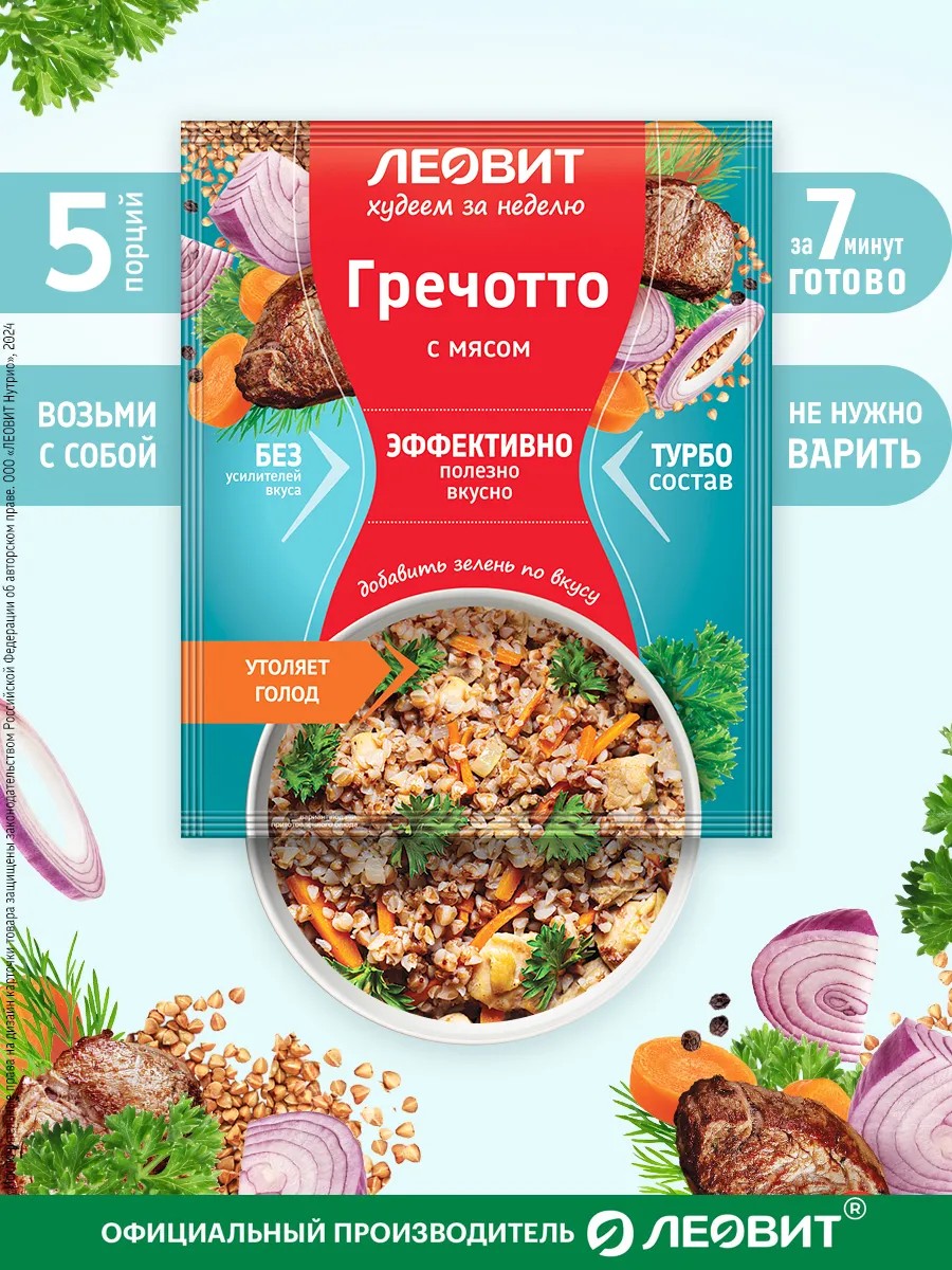 Гречотто с мясом быстрого приготовления в пакетиках от Леовит - идеальный выбор для тех, кто ценит вкус и заботится о фигуре - в одной порции всего 154 Ккал!