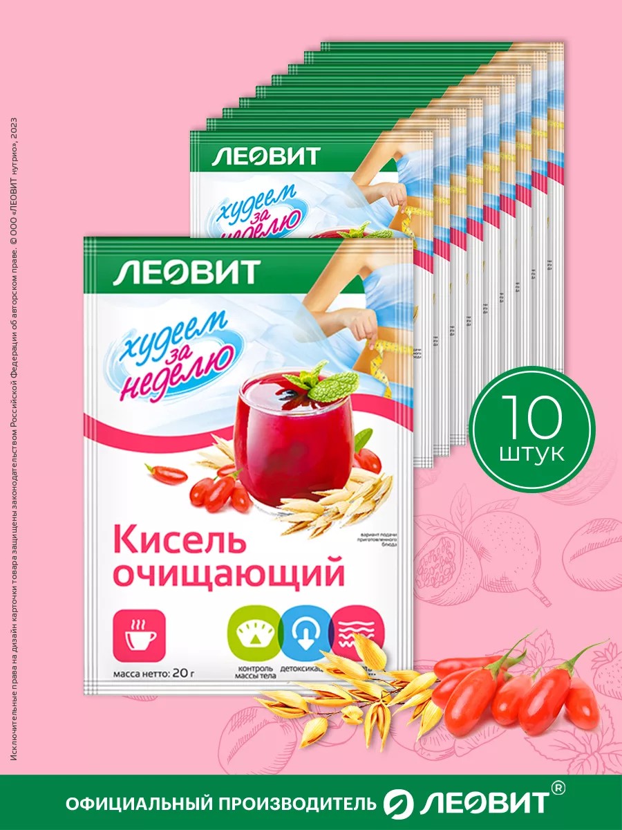 Худеем за неделю Леовит Кисель Очищающий диетический. 10 пакетов по 20 г. Упаковка 200 г.. Диетический овсяный кисель от ЛЕОВИТ - прекрасный выбор для тех, кто хочет провести мягкий детокс организма и помочь ему избавиться от лишнего.Эффективный детокс комплекс оказывает очищающее действие (сельдерей, рыльца кукурузы, кориандр, барбарис, лавровый лист, пищевые волокна), улучшает процессы пищеварения (пищевые волокна, кориандр, барбарис, лавровый лист), ускоряет процессы выведения продуктов обмена и улучшает работу кишечника (сельдерей, пищевые волокна, магний, рыльца кукурузы), способствует уменьшению чувства голода (пищевые волокна), обладает обволакивающим действием (овес).Кисель упакован в удобные порционные пакетики. Его легко взять с собой в дорогу, чтобы вкусный и полезный напиток для очищения организма был всегда под рукой. Не ОРСОФИТ