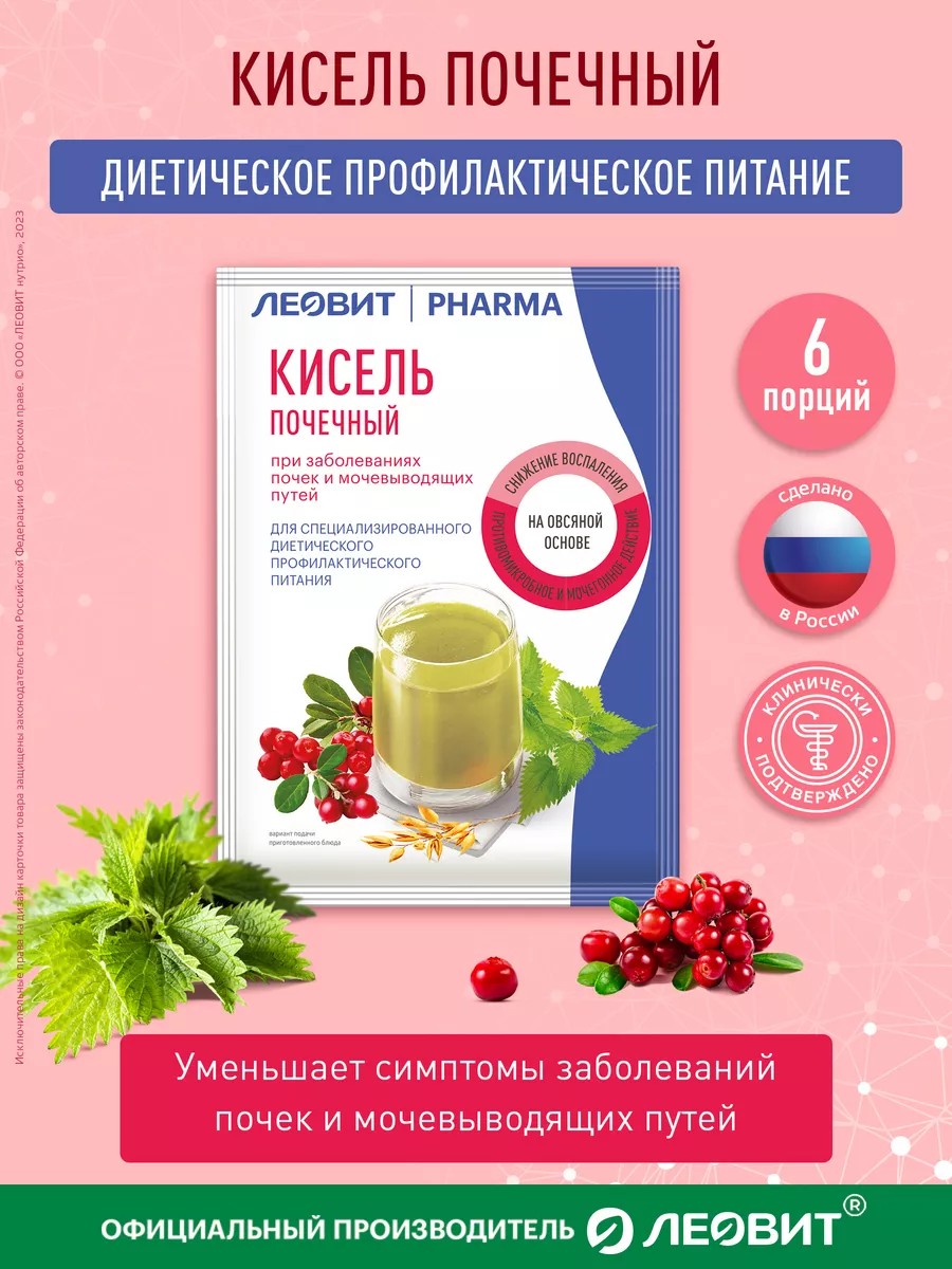 Кисель Почечный это специализированный пищевой продукт диетического профилактического питания. Продукт рекомендован при лечении инфекций мочевого пузыря (цистита, уретрита и др.) и почек, при неинфекционных хронических воспалениях почек, нефрологии. Диета – это основа терапии при болезнях почек. Кисель ЛЕОВИТ применяется в качестве диетотерапии в комплексном лечении воспалительных заболеваний мочевой системы в период реконвалесценции и ремиссии, является мерой повышения эффективности базовой терапии. Продукт оказывает противовоспалительное действие, мочегонное действие (без вымывания калия и натрия), снижает диспепсические явления, дизурический и болевой синдром, улучшает показатели мочи, снижает риск рецидива. Кисель рекомендован в качестве монотерапии и в комплексной терапии с противовоспалительными препаратами в стадии обострения. Напиток поможет нормализовать водно-солевой обмен в организме, улучшить функции почек в поддержании баланса минеральных веществ в организме, оказывает обволакивающее и заживляющее действие, восстанавливают микрофлору. Продукт имеет клинически подтвержденную эффективность.