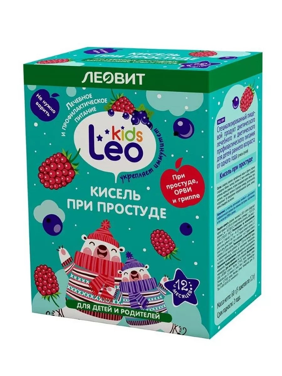 Бренд ЛЕОВИТ - это бренд биологически активных добавок и специального питания для поддержание здоровья и профилактику различных заболеваний.ЛЕОВИТ LEO KIDS КИСЕЛЬ ДЛЯ ДЕТЕЙ ПРИ ПРОСТУДЕ - специализированный пищевой продукт диетического лечебного и диетического профилактического питания для детей от одного года (сухой порошок)На предприятии перерабатываются: арахис, кунжут, орехи, сельдерей, соя, молоко. Ввиду использования натуральных ингредиентов возможно наличие в готовом напитке осадка из мелких кусочков измельченных трав, ягод и фруктов.Пищевая ценность (средние значения) в 100 г сухого продукта / в одной порции (12 г) / % от суточной нормы:углеводы, г - 91,3/11/6,витамин С, мг - 417/50/111,энергетическая ценнопь, кДж (ккал) -1560 (370)/187 (44)/3.Витамины и лекарственные травы в составе вкусного натурального киселя помогут малышу быстрее справиться с симптомами простудных заболеваний: кашлем, насморком, головной болью, заложенностью носа, слабостью.Компоненты продукта оказывают болеутоляющее, противовоспалительное, антисептическое действие, снижают температуру.Компоненты в составе:- витамин C укрепляет иммунитет, выводит из организма токсины- мать-и-мачеха оказывает смягчающее и отхаркивающее действие, способствует уменьшению кашля- ромашка обладает противовоспалительным, тонизирующим действием- корень девясила способствует отхождению мокроты- смородина чёрная оказывает общеукрепляющее действие- малина обладает противовоспалительным и болеутоляющим действием, снижает температуру- корень солодки обладает бронхолитическим, противолихорадочным действиемВ основе каждого киселя для детей от года Leo Kids уникальный сбор лекарственных трав, безопасность и эффективность которого доказаны клинически. Продукт разработан российскими специалистами в области диетологии и нутрициологии и рекомендован педиатрами России.ПоказанияВ период лечения и долечивания сезонных простудных заболеваний, в том числе острых респираторных вирусных инфекций.Для снижения риска развития осл
