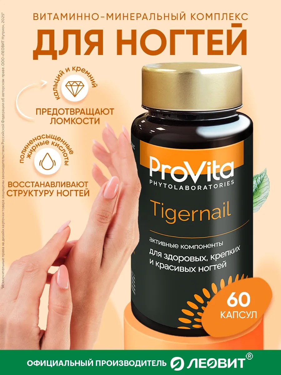 TIGERNAIL nail vitamins are based on exclusive Swiss herbal recipes and incorporate innovative technologies. The multivitamins in PROVITA dietary supplements contain functional dosages of components calculated to ensure maximum positive effects without overloading the body. A 2-month course for adults is 1 capsule twice daily with meals. LEOVIT products are manufactured in accordance with international ISO and HACCP standards, which guarantees that production processes meet strict quality and safety standards. The complex is available in capsules made of 100% natural gelatin, capsules without preservatives, added dyes, and titanium dioxide.