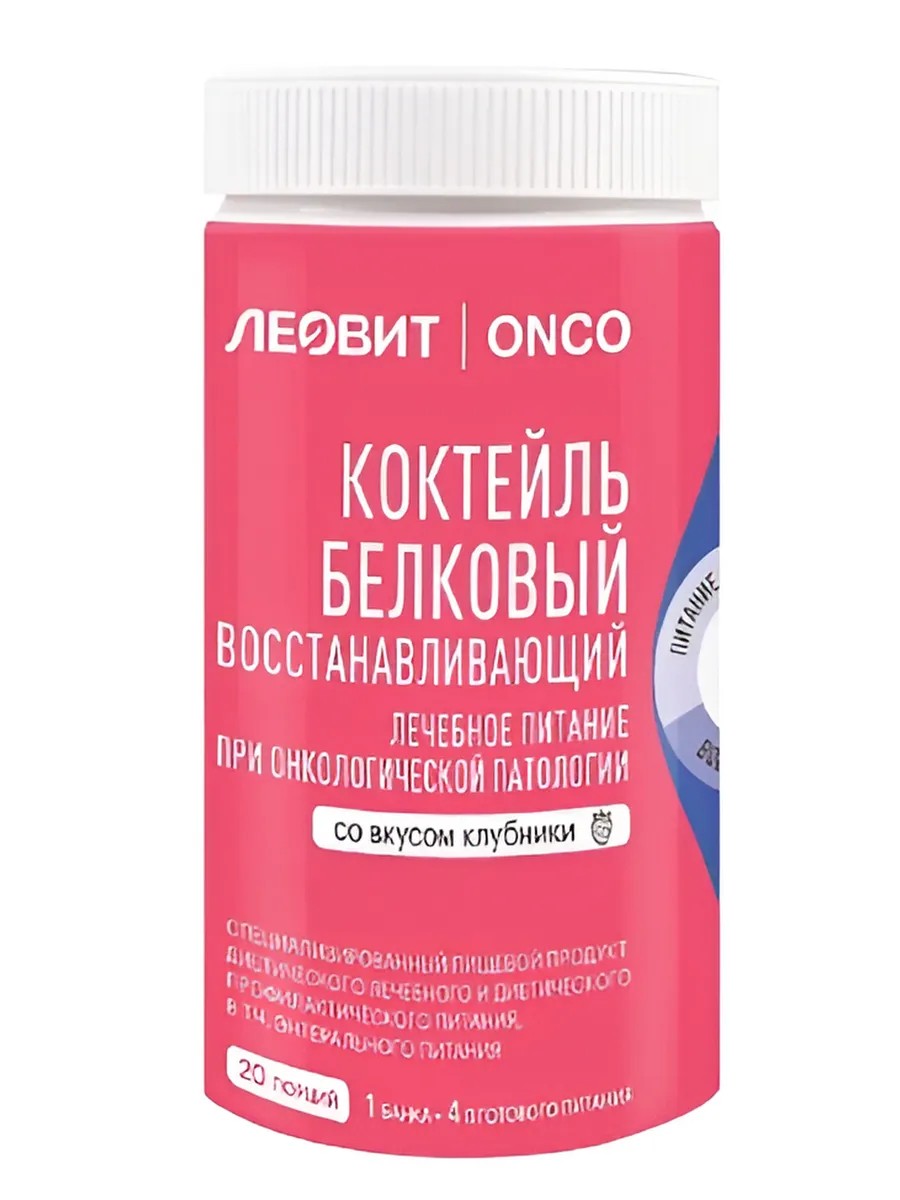 Leovit onco/onco protein cocktail, strawberry flavor, restorative for oncological pathology, is a specialized food product for dietary therapeutic and dietary preventive nutrition, a completely new form of nutritional support developed in collaboration with oncologists to address nutritional issues and improve the overall condition of cancer patients, including those that worsen during treatment. The cocktail promotes a more rapid recovery of patients in the postoperative period, reduces the side effects of therapy, and helps replenish missing nutrients and prevent the development of asthenia and cachexia. It is recommended as a specialized food product for dietary therapeutic and dietary preventive nutrition, including for enteral nutrition (tube and oral use), for body recovery, including in children over 12 years of age with high protein and energy needs, for various diseases, including: for burns, injuries, gastrointestinal diseases, oncological pathologies, cystic fibrosis, tuberculosis, palliative conditions, age-related disorders, cachexia; in the pre- and postoperative period; during and after chemotherapy and radiation therapy; during the rehabilitation period.