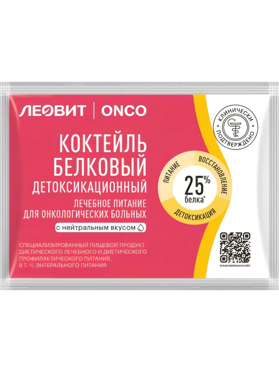 LEOVIT PROTEIN DETOXIFICATION COCKTAIL FOR CANCER PATIENTS WITH A NEUTRAL TASTE 20.0LEOVIT PROTEIN DETOXIFICATION COCKTAIL FOR CANCER PATIENTS WITH A NEUTRAL TASTE - A specialized food product for dietary therapeutic and dietary preventive nutrition for cancer patients. LEOVIT ONCO is a completely new form of nutritional support, which was developed jointly with oncologists to solve nutritional problems and improve the general condition of cancer patients, including those that worsen during treatment. LEOVIT ONCO products are well tolerated, do not cause allergic reactions, increase appetite, suppress symptoms of nausea and vomiting, and stop catastrophic weight loss. The cocktail has a general tonic, antioxidant, anti-inflammatory, analgesic properties, saturates with coenzymes involved in the elimination and neutralization of the resulting toxins, eliminates the toxic manifestations of the disease. LEOVIT ONCO nutrition is recommended: • during and after antitumor therapy • after surgery to remove a tumor • in case of difficulty in passing food or impaired absorption of nutrients • to prevent loss of weight, strength and loss of appetite or unwillingness to eat. Nutritional value (average values) per 100 g of dry product / in one serving (20 g) / % SDV *: proteins, g - 25/5/7, fats, g - 14/2.8/3, carbohydrates, g - 45/9/2, vitamin A, mg - 4.3/0.86/108, riboflavin, mg - 5/1/63, niacin, mg - 39/7.8/43, vitamin C, mg - 90/18/30, vitamin B6, mg - 3/0.6/30, taurine, mg - 300/60/15, caffeine, mg - 38/7.6/15, succinic acid, mg - 100/20/10, vitamin E, mg - 3/0.6/6, manganese, mg - 0.5/0.1/5, selenium, mcg - 18/3.6/5, zinc, mg - 3/0.6/4, dietary fiber, g - 6/1.2/4, energy value, kJ/kcal - 1708 (406)/342 (81)/3.* average daily requirement 00