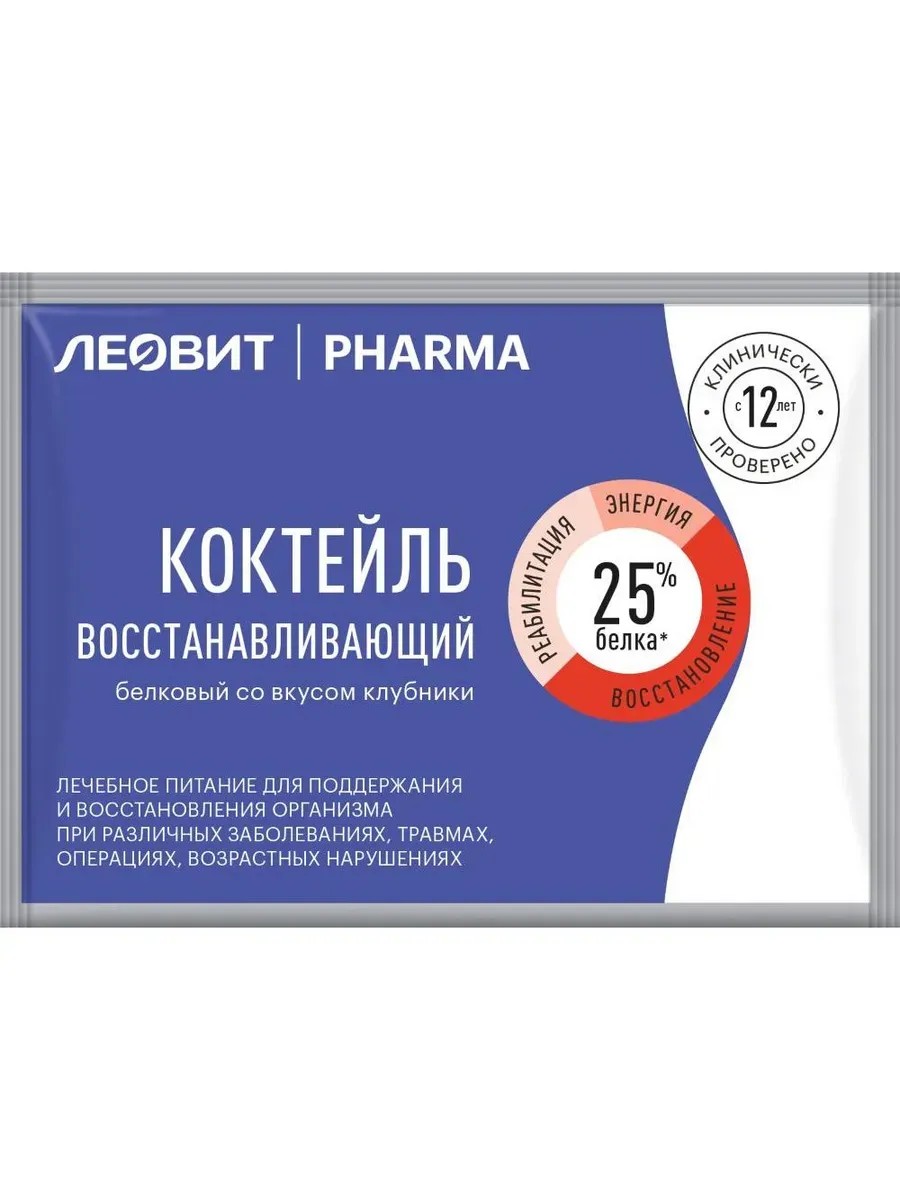 леовит pharma коктейль белковый восстанавливающий со вкусом клубники 20,0. восстановление специализированный пищевой продукт диетического лечебного и диетического профилактического питания, в т.ч. для энтерального питания - абсолютно новая форма нутритивной поддержки взрослых и детей старше 12 лет, с высокими потребностями в белке и энергии, при различных заболеваниях, в точм числе ожогах, травмах, заболеваниях желудочно-кишечного тракта, при онкологической патологии, муковисцедозе, туберкулезе, паллиативных состояниях, возрастных нарушениях, кахексии, в пред- и послеоперационном периоде, вы периоде после химио- и лучевой терапии, в период реабилитации белки молочные и растительные (молоко сухое цельное, концентрат сывороточного белка, соевый белок), сахароза, пищевые волокна (инулин, гуаровая камедь, пектин), ароматизаторы натуральные, мальтодекстрин, экстракты (родиолы розовой, девясила, бессмертника, облепихи, барбариса, одуванчика), крахмал картофельный, витамины (с, рр (ниацин), в5 (пантотеновая кислота), е, в6, в2 (рибофлавин), в1 (тиамин), в9 (фолиевая кислота), н (биотин), в12), биологически активное вещество – янтарная кислота, яблоки, регуляторы кислотности (лимонная кислота, фосфат кальция), красители (диоксид титана, кармин) леовит pharma/фарма коктейль белковый восстанавливающий со вкусом клубники - специализированный пищевой продукт диетического лечебного и диетического профилактического питания, в т.ч. энтерального, для детей старше 12 лет и взрослых.леовит pharma коктейль белковый восстанавливающий - это специализированный пищевой продукт диетического лечебного и диетического профилактического питания, в т.ч. для энтерального питания (зондового и перорального использования), для восстановления организма, в том числе детей старше 12 лет, с высокими потребностями в белке и энергии, при различных заболеваниях, в т.ч. при ожогах, травмах, заболеваниях желудочно-кишечного тракта, при онкологической патологии, муковисцидозе, туберкулезе, паллиативных сос