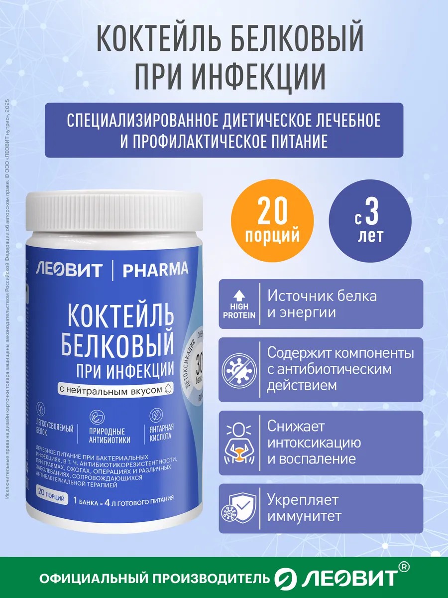 LEOVIT PHARMA/PHARMA Neutral-tasting protein cocktail for infections is a specialized therapeutic nutritional supplement containing easily digestible proteins, fats, carbohydrates, vitamins, trace elements, biologically active substances, and medicinal plant extracts, including natural antibiotics. Propolis has antibacterial, antiviral, antifungal, anti-inflammatory, immunostimulating, regenerative, and antioxidant activity. Due to its antibiotic properties, propolis has an effect on gram-positive bacteria (Staphylococcus aureus, diphtheria, and E. coli). Dandelion has antioxidant, anti-inflammatory, restorative, and antiviral effects. Rhodiola rosea helps increase the body's nonspecific resistance to many diseases, but especially to infectious diseases. Burdock root has an anti-inflammatory effect. Milk thistle has an anti-inflammatory effect and enhances the liver's defenses against infections.