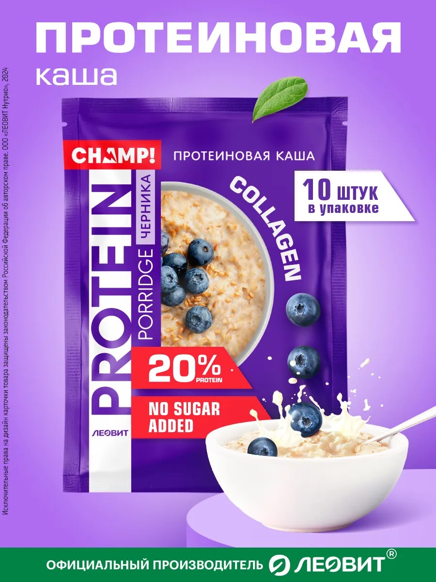Каша протеиновая овсяная со льном Champ! Черника. 10 пакетов