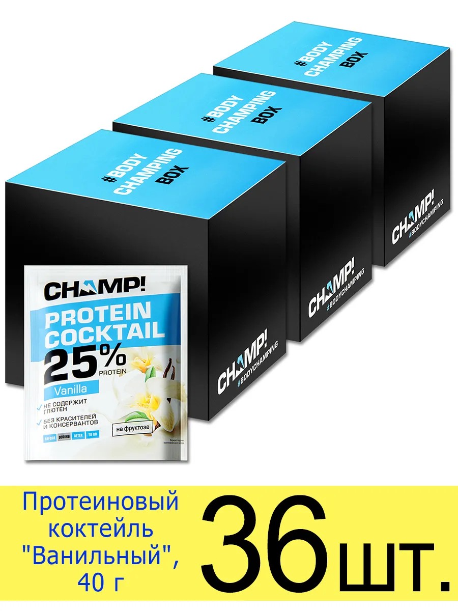 Protein shake "Vanilla" CHAMP portioned, 40 g. Protein shake CHAMP! with protein is a tasty and healthy drink, the protein in the composition is necessary for muscle growth.
