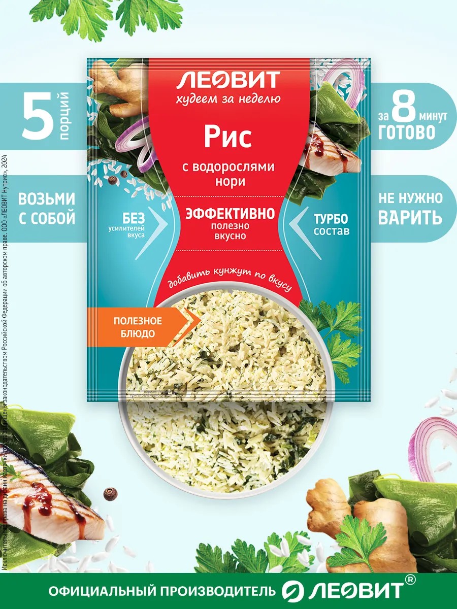 Рис с водорослями нори быстрого приготовления в пакетиках от Леовит - идеальный выбор для тех, кто ценит вкус и заботится о фигуре - в одной порции всего 104 Ккал!