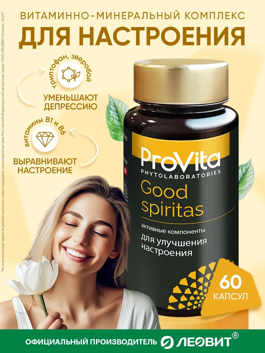 PROVITA GOODSPIRITAS is a specially developed complex of vitamins for women and men to improve mood with natural plant extracts that help maintain a healthy nervous system.