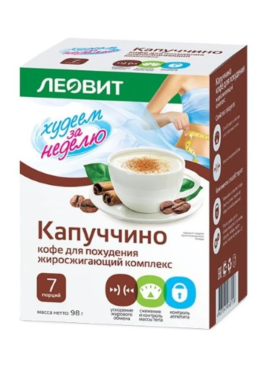 леовит худеем за неделю капуччин кофе д/похуд 14,0 n7. сгорание жира, контроль аппетита, снижение веса для похудения; жиросжигающий комплекс кофе натуральный растворимый, пряности /имбирь, корица, куркума, кардамон/, l-карнитин, кислота аскорбиновая, инулин, камедь гаровая ароматизатор, бромелайн, экстракт гарцинии камбодийской, хрома пиколинат; основа; сливки растительные, сахар физическая форма сегодня обладает очень важным значением. ведь, быть в форме сейчас означает быть уверенным в себе и вполне успешным человеком. в этом случае разнообразные напитки, контролирующие вес, могут стать незаменимыми помощниками для поддержания надлежащей формы и действительно стройной фигуры. достаточно лишь заменить свой привычный кофе чашечкой ароматного и вкусного капуччино для похудения леовит, и вы тут же получите не просто потрясающий вкус, но еще и некоторые специализированные свойства, направленные непосредственно на контроль веса вашего тела.