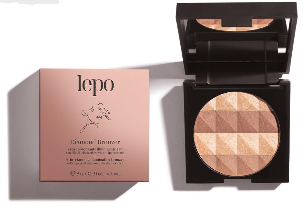 LEPO DIAMOND BRONZER - A 2-in-1 face powder that combines the effect of a bronzer with the luminosity of a radiant tan. Its two-tone texture, enriched with jojoba oil and horse chestnut extract, offers a natural sun-kissed effect, enhancing every complexion. Ideal for creating intense highlights or for a diffused application, it's perfect for a radiant and harmonious look. Eco-friendly packaging made with 70 recycled plastic, for sustainable beauty. A product made in Italy that combines quality and respect for the environment. INGREDIENTS LIGHT SHADE: Talc, Mica, Octyldodecyl Stearate, Magnesium Stearate, Helianthus Annuus (Sunflower) Seed Oil, Simmondsia Chinensis (Jojoba) Seed Oil, Sorbic Acid, Tocopheryl Acetate, Aesculus Hippocastanum (Horse Chestnut) Seed Extract, Titanium Dioxide, Parfum (Fragrance), Ceramic NP. May Contain: CI 77891 (Titanium Dioxide), CI 77492, CI 77491, CI 77499 (Iron Oxides). MATTE SHADE: Talc, Octyldodecyl stearate, Magnesium stearate, Helianthus annuus (Sunflower) Seed Oil, Simmondsia chinensis (Jojoba) Seed Oil, Sorbic Acid, Tocopheryl Acetate, Aesculus hippocastanum (Horse Chestnut) Seed Extract, Parfum (Fragrance), Ceramic NP. May Contain: CI 77891 (Titanium Dioxide), CI 77491, CI 77492, CI 77499 (Iron Oxides). SAFETY WARNING For external use only. Avoid contact with eyes. See moreLEPO: The Made in Italy brand that has been caring for beauty for over 30 years with natural and organic makeup and skincare products that are safe for the skin and in harmony with the planet. Eco-friendly packaging: the container is made from 70 recycled plastic for a more sustainable approach to makeup. Versatile for every skin tone: this face powder is ideal for enhancing every complexion thanks to the two available shades, perfect for a harmonious and luminous look. For application, use a brush for a diffused effect or your fingers to create intense highlights on the face and décolleté. Formula rich in active ingredients: enriched with jojoba oil, horse chestnut extract, and vitamin E, it offers hydration, protection, and antioxidant properties. NATURAL AND RADIANT GLOW: a limited-edition two-tone texture, a perfect blend of bronzer and highlighter for a sophisticated sun-kissed effect.LEPO DIAMOND BRONZER, Terre Bronzante Illuminante 2 en 1. N 20 Gold, avec huile de jojoba et extrait de marronnier d'IndeDESCRIPTION DU PRODUIT DESCRIPTION DU PRODUIT LEPO DIAMOND BRONZER - Une terre visage maquillage 2 en 1 qui combine l'effet d'une terre bronzante visage avec la luminosité d'un bronzage illuminant. Sa texture bicolore enrichie en huile de jojoba et en extrait de marronnier d'Inde offre un effet Sun-Kissed naturel, mettant en valeur chaque teint. Idéal pour créer des points de lumière intenses ou pour une application diffuse, il est parfait pour un look radieux et harmonieux. Emballage écologique avec 70 de plastique recyclé, pour une beauté durable. Un produit fabriqué en Italie qui allie qualité et respect de l'environnement. INGRÉDIENTS NUANCE LIGHT : Talc, Mica, Octyldodecyl Stearate, stéarate de magnésium, Helianthus annuus (Sunflower) Seed Oil, Simmondsia chinensis (Jojoba) Seed Oil, Sorbic Acid, Tocopheryl Acétate Aesculus hippocastanum (Horse Chestnut) Seed Extract, Tt. En oxyde, parfum (Fragrance), céramique NP. May Contain: CI 77891 (Titanium Dioxyde), CI 77492, CI 77491, CI 77499 (Iron Oxides). NUANCE MAT : Talc, Octyldodecyl stéarate, stéarate de magnésium, Helianthus annuus (Sunflower) Seed Oil, Simmondsia chinensis (Jojoba) Seed Oil, Sorbic Acid, Tocopheryl Acétate Aesculus hippocastanum (Horse Chestnut) Seed Extract, Parfum (Fragoz. rance), céramique NP. May Contain: CI 77891 (Titanium Dioxyde), CI 77491, CI 77492, CI 77499 (Iron Oxides). AVERTISSEMENT DE SÉCURITÉ Usage extérieur uniquement. Évitez tout contact avec les yeux. Voir plusLEPO: La marque Made in Italy qui prend soin de la beauté depuis plus de 30 ans avec des produits de maquillage et de peau naturels et biologiques, sans danger pour la peau et en harmonie avec la planète. Emballage écologique : récipient fabriqué à 70 avec du plastique recyclé pour une approche plus durable du maquillage. Polyvalent pour chaque teint : terre de maquillage visage idéale pour mettre en valeur chaque teint grâce aux 2 nuances disponibles, parfaites pour un look harmonieux et lumineux. Pour l'application, utilisez un pinceau pour un effet diffus ou les doigts pour créer des points de lumière intenses sur le visage et le décolleté. Formule riche en actifs : enrichie en huile de jojoba, extrait de marronnier et vitamine E, offre hydratation, protection et propriétés antioxydantes. GLOW NATURELLE ET RADIOSE : texture bicolore en édition limitée, un mélange parfait entre bronzeur et illuminant pour un effet sun kissed sophistiqué.