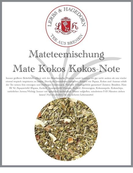 Brazilian yerba mate is enjoying increg popularity, so we couldn't resist indulging in another tropical twist. Thanks to special exotic ingredients like papaya, coconut, and pineapple, the tea retains its delicate, creamy, and fruity flavor. Warning: guaranteed holiday feeling! Ingredients: Brazilian yerba mate (51 ), papaya cubes (papaya, sugar), pineapple cubes (pineapple, sugar), lemongrass, grated coconut, coconut flakes, natural flavoring. Important: Always use freshly boiled sparkling water and let it steep for at least 5-10 minutes! This is the only way to ensure safe consumption.